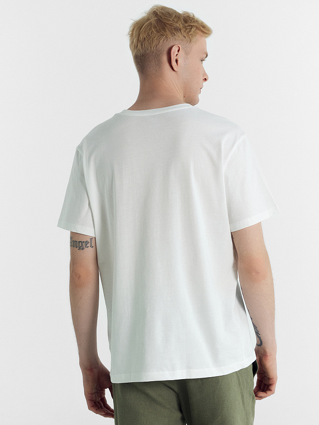 Футболка мужская свободного силуэта из трикотажного полотна кулирка. Горловина круглой формы, обтачка из рибаны. По горловине проложена отделочная строчка. Бейка по горловине спинки из кулирки. Рукав втачной, короткий.