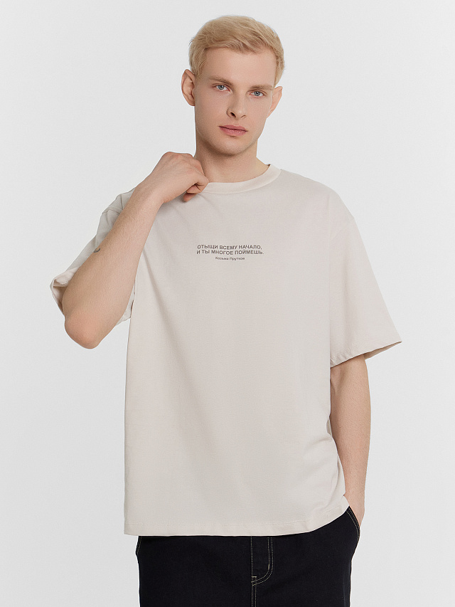 Стильная мужская футболка в однотонной расцветке с принтом в виде надписи "Отыщи всему начало, и ты многое поймешь. (с) Козьма Прутков". Модель полностью состоит из натурального хлопка. Изделие свободного силуэта со слегка спущенным плечом, длиной до линии бедер. Горловина круглой формы, рукава короткие. Отличный вариант для повседневной носки, спорта и активного отдыха. В линейке широкий размерный и цветовой ряд. Рекомендуем!