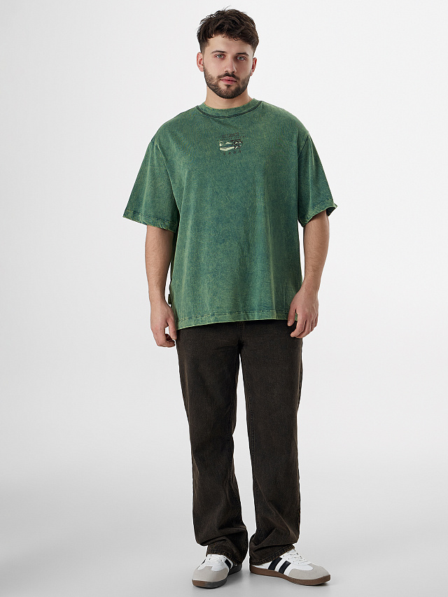 Футболка выполнена из хлопка. Этот материал дышащий, приятный к коже и идеально сочетается с техникой кислотной стирки, подчеркивая её текстуру.