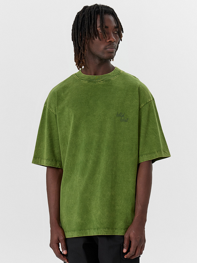Футболка мужская зеленая с обработкой эйсид и надписью "Wild West"