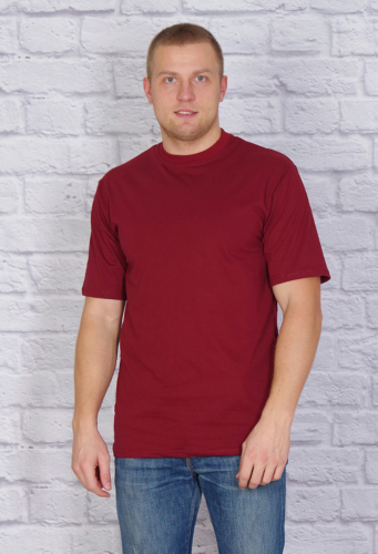 Футболка мужская однотонная, классический (прямой) покрой, горловина изделия обработана рибаной, модель имеет разные расцветки. В изготовлении футболок, используется трикотажное кулирное полотно, состоящее из 100% хлопка, плотностью 150-160  г/м2.