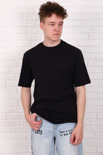 Футболка мужская однотонная, классический (прямой) покрой, горловина изделия обработана рибаной, модель имеет разные расцветки. В изготовлении футболок, используется трикотажное кулирное полотно, состоящее из 100% хлопка, плотностью 150-160  г/м2.
