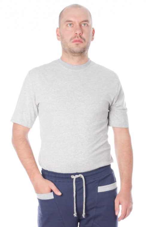 Футболка мужская однотонная, классический (прямой) покрой, горловина изделия обработана рибаной, модель имеет разные расцветки. В изготовлении футболок, используется трикотажное кулирное полотно, состоящее из 100% хлопка, плотностью 150-160  г/м2.