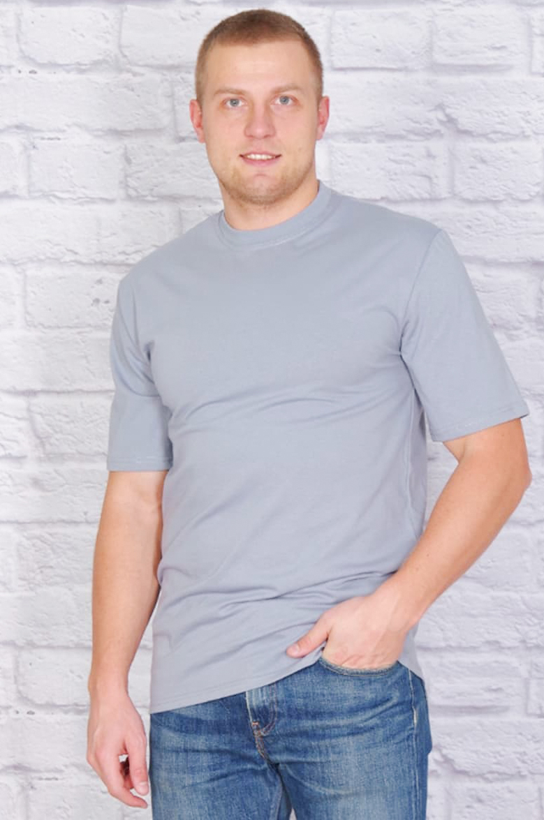 Футболка мужская однотонная, классический (прямой) покрой, горловина изделия обработана рибаной, модель имеет разные расцветки. В изготовлении футболок, используется трикотажное кулирное полотно, состоящее из 100% хлопка, плотностью 150-160  г/м2.