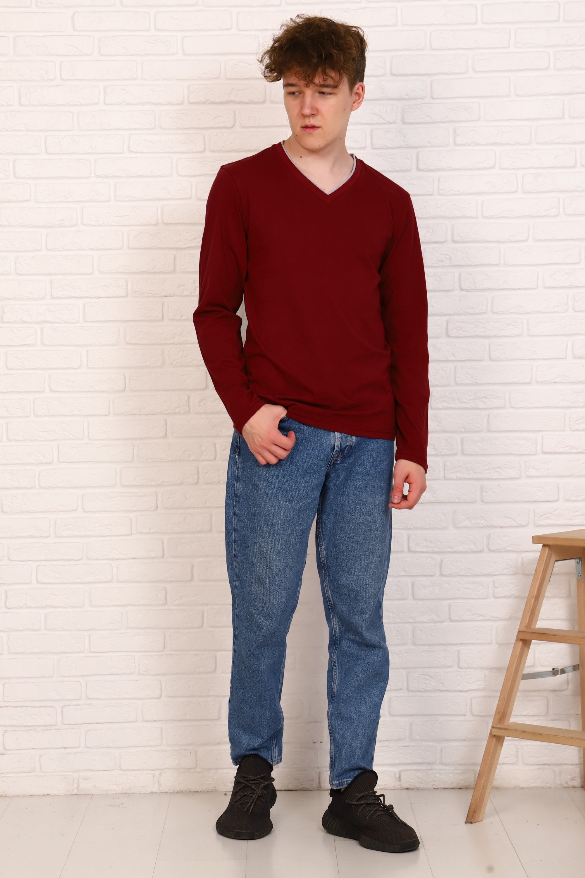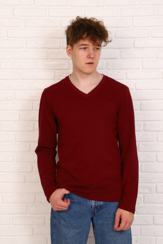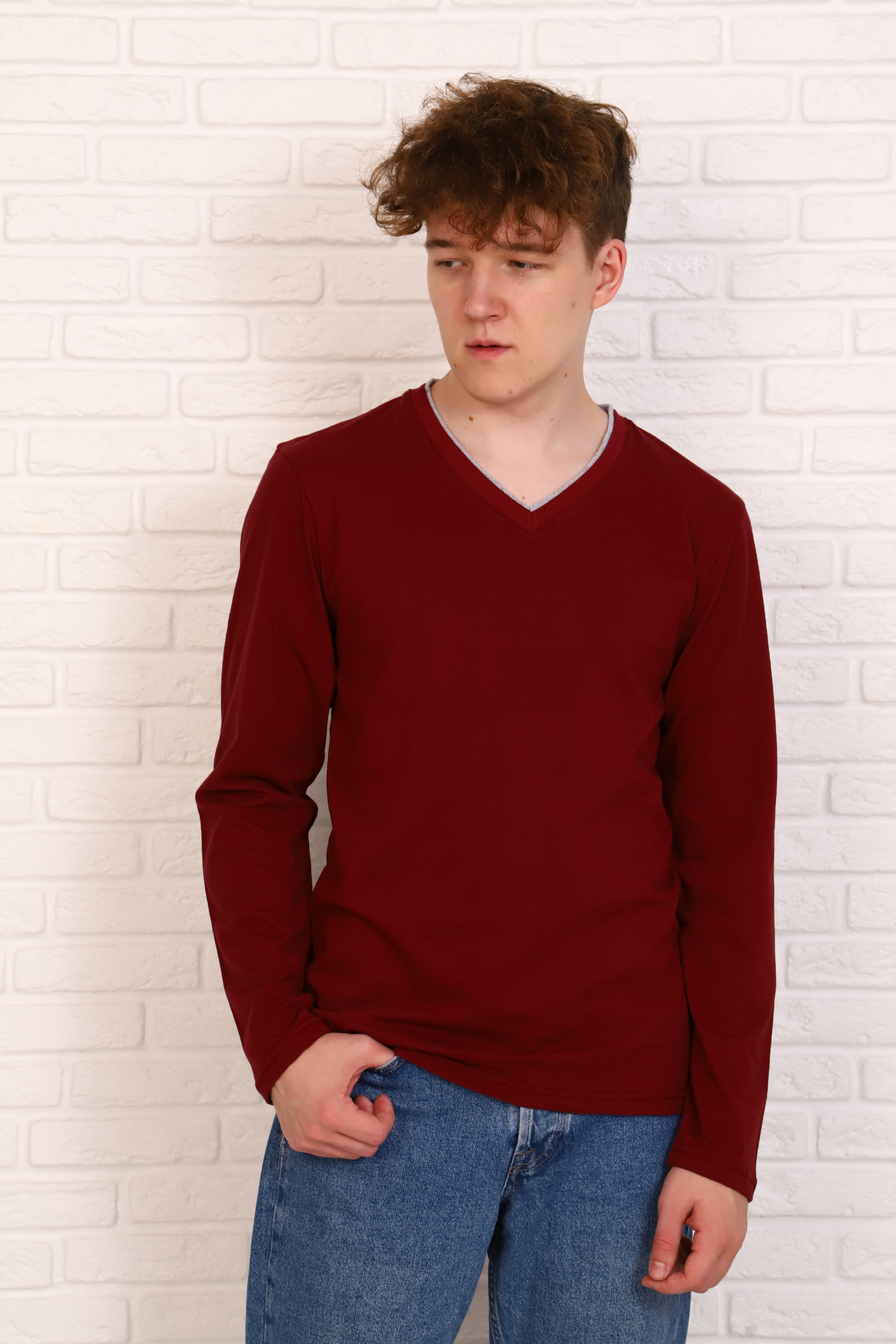 Стильная однотонная футболка с длинным рукавом и V - образным вырезом. Отделка горловины из рибаны контрастных цветов добавляет изюминку модели. Футболка универсальная, хорошо сочетается как с деловой так и с повседневной одеждой.