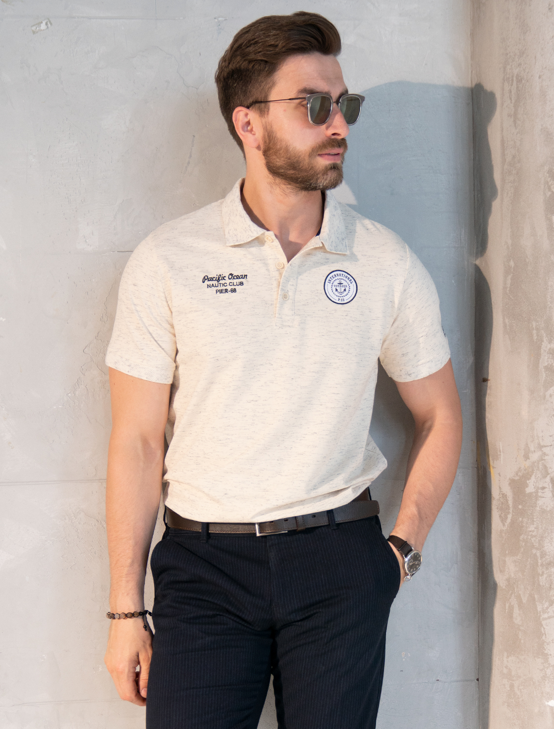 Белое прямое поло выполнено из премиального хлопка пике с характерной фактурой, которая обеспечивает эффективную циркуляцию воздуха. Наличие эластана в составе изделия способствует эластичности и меньшей сминаемости. Спереди – вышивка в морской тематике, внизу металлический логотип бренда.