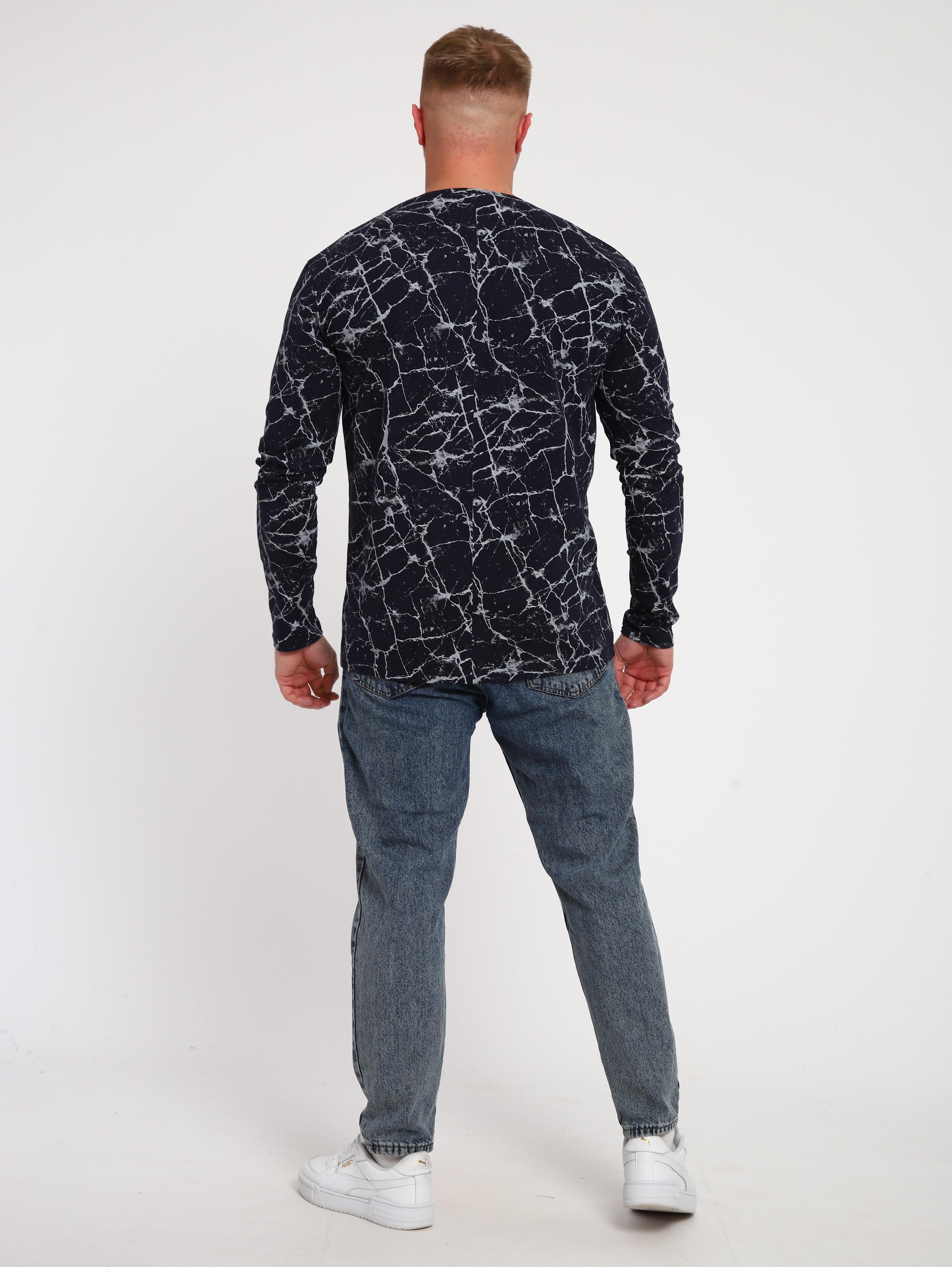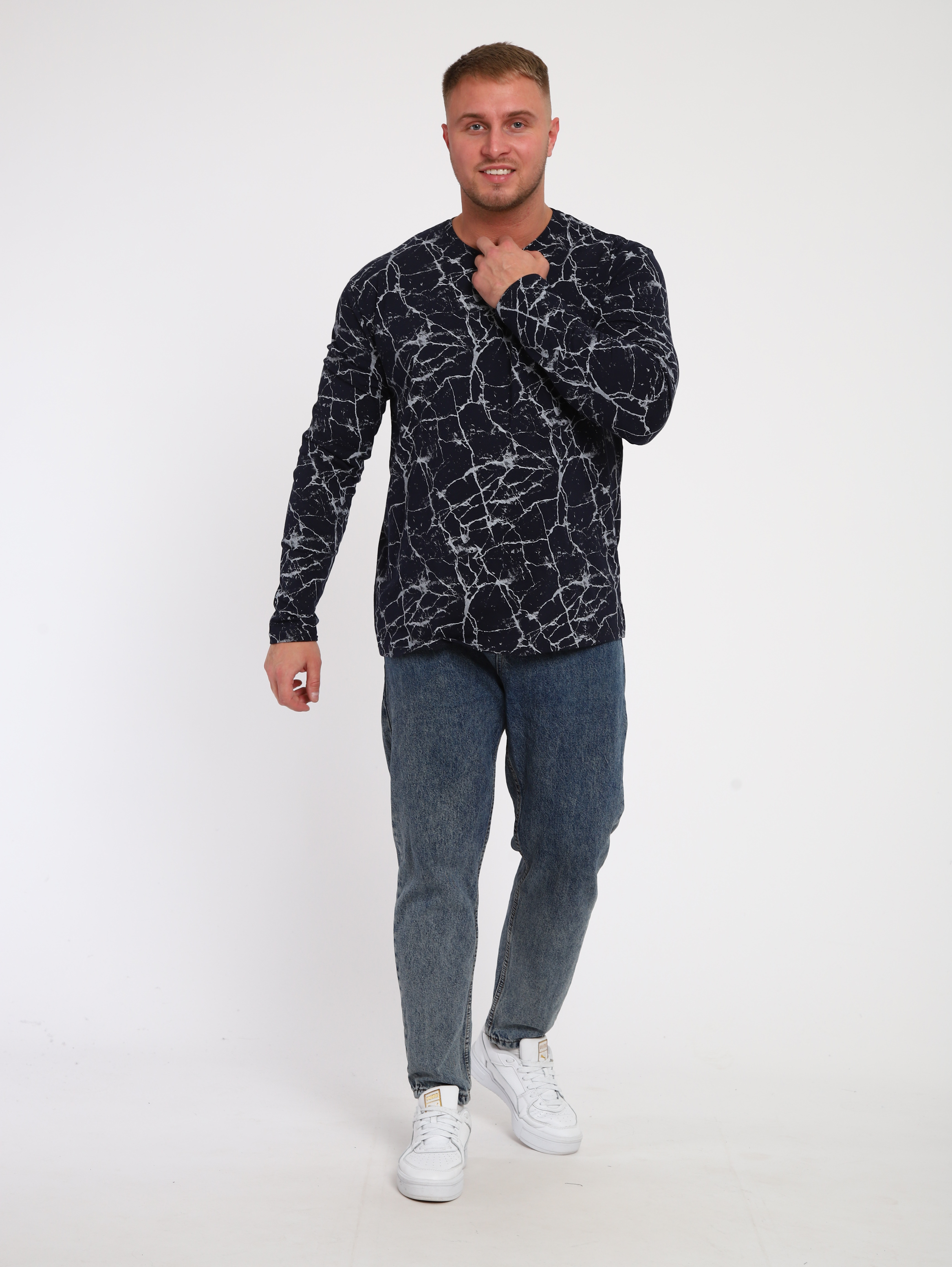 Хлопковая мужская футболка с длинным рукавом. Модель прямого кроя. Эффектная, стильная расцветка "под мрамор" отлично сочетается с джинсами.