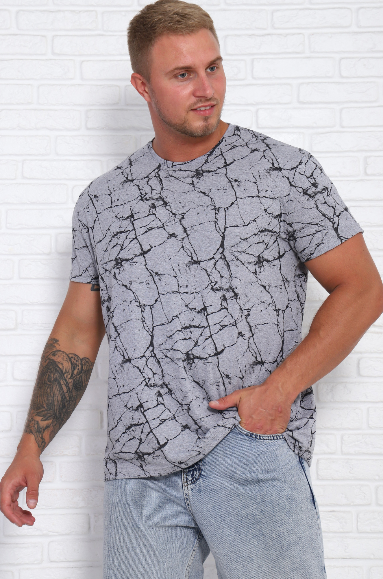 Хлопковая мужская футболка прямого кроя. Эффектная, стильная расцветка "под мрамор" отлично сочетается с джинсами.