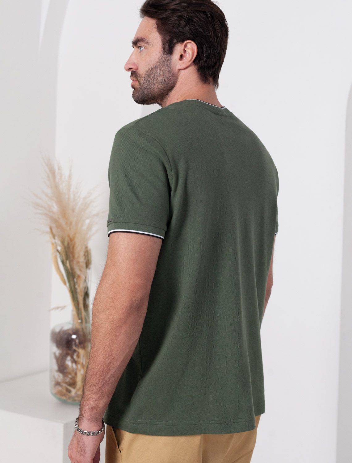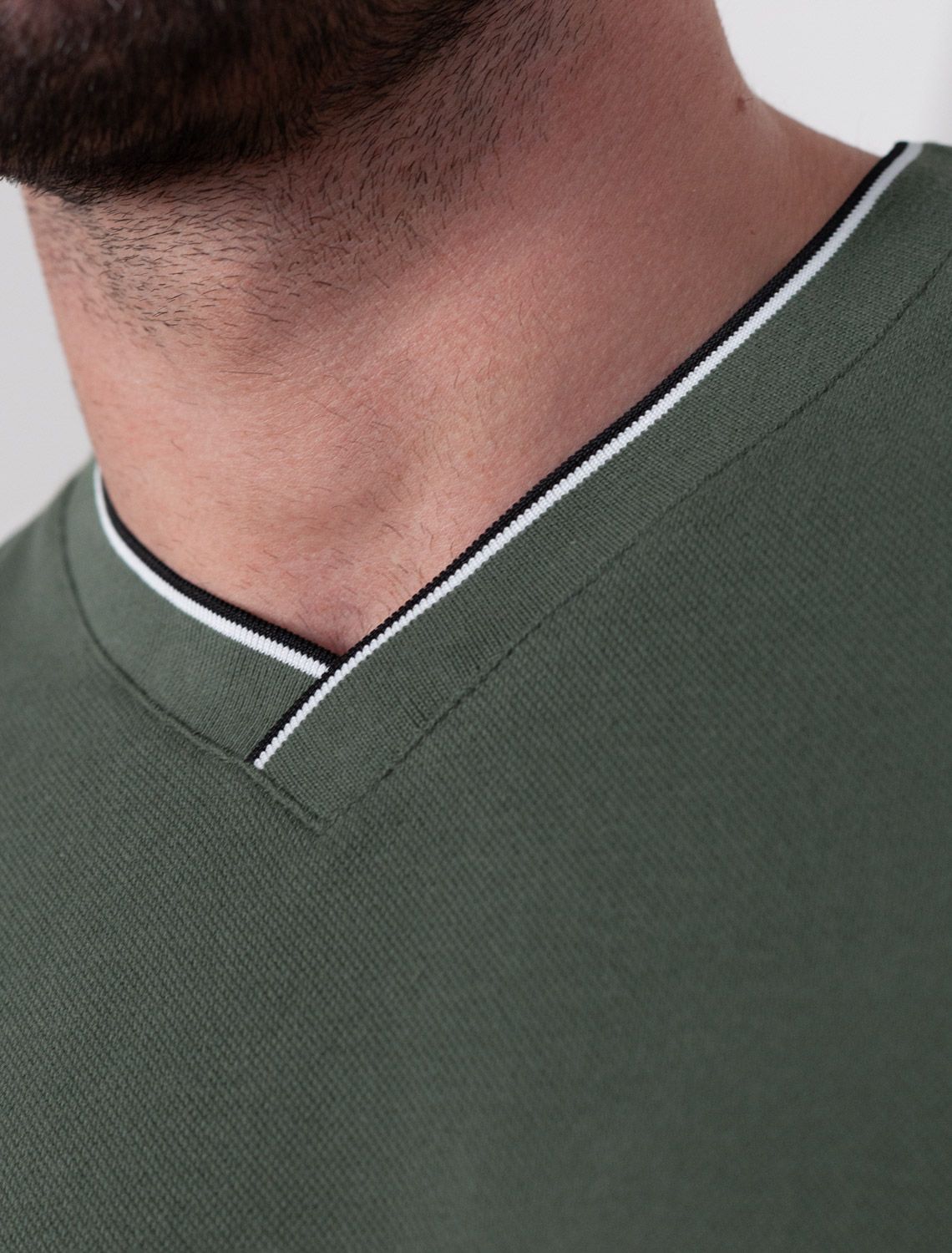 Футболка темно-оливкового цвета с аккуратным V-образным вырезом выполнена из премиального хлопка с эластаном плотностью 200 Г/м2. Высококачественный эластичный хлопок обеспечивает мягкость, воздухопроницаемость и идеальную посадку на любую фигуру и размеры, включая 58 размер. Классический прямой крой футболки подчеркивает фигуру, но не сковывает движений. Элегантный небольшой V-образный вырез с контрастной полосой визуально удлиняет шею, а минималистичная вышивка на груди в виде логотипа бренда добавляет изысканности и индивидуальности, не перегружая образ. Эта базовая футболка - идеальный баланс комфорта и стиля для современного мужчины, легко сочетается с разными низами, создавая образ от кэжуал до более элегантного. Стильная футболка подходит как для повседневной носки, так и для создания более нарядных образов.