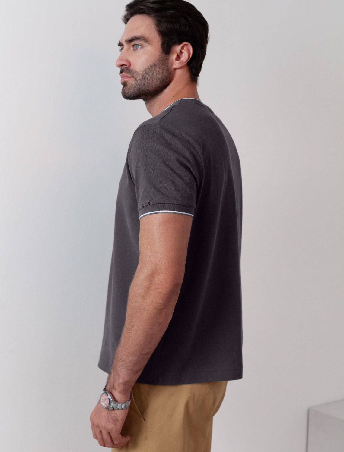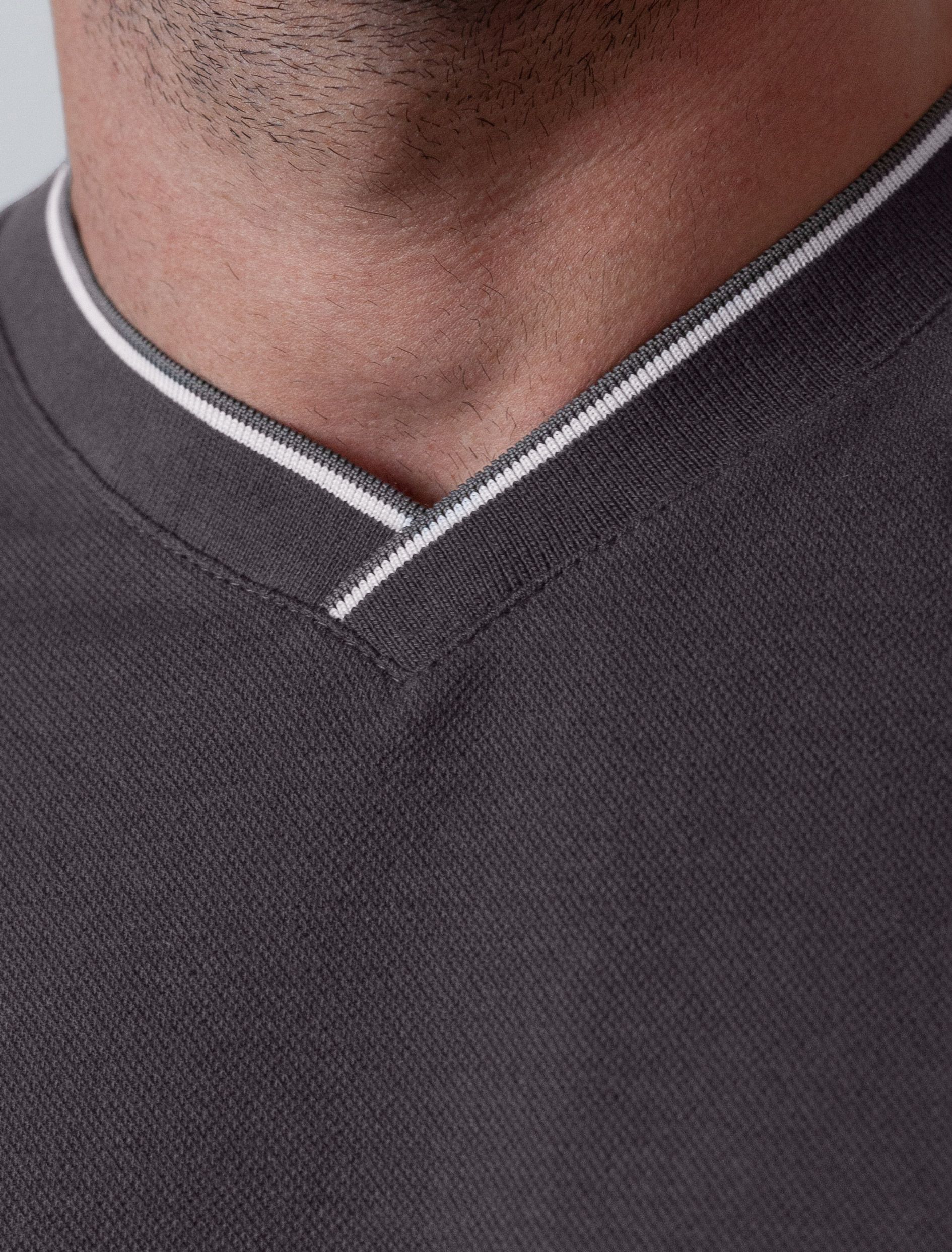 Футболка темно-серого цвета с аккуратным V-образным вырезом выполнена из премиального хлопка с эластаном плотностью 200 Г/м2. Высококачественный эластичный хлопок обеспечивает мягкость, воздухопроницаемость и идеальную посадку на любую фигуру и размеры, включая 58 размер. Классический прямой крой футболки подчеркивает фигуру, но не сковывает движений. Элегантный небольшой V-образный вырез с контрастной полосой визуально удлиняет шею, а минималистичная вышивка на груди в виде логотипа бренда добавляет изысканности и индивидуальности, не перегружая образ. Эта базовая футболка - идеальный баланс комфорта и стиля для современного мужчины, легко сочетается с разными низами, создавая образ от кэжуал до более элегантного. Стильная футболка подходит как для повседневной носки, так и для создания более нарядных образов.