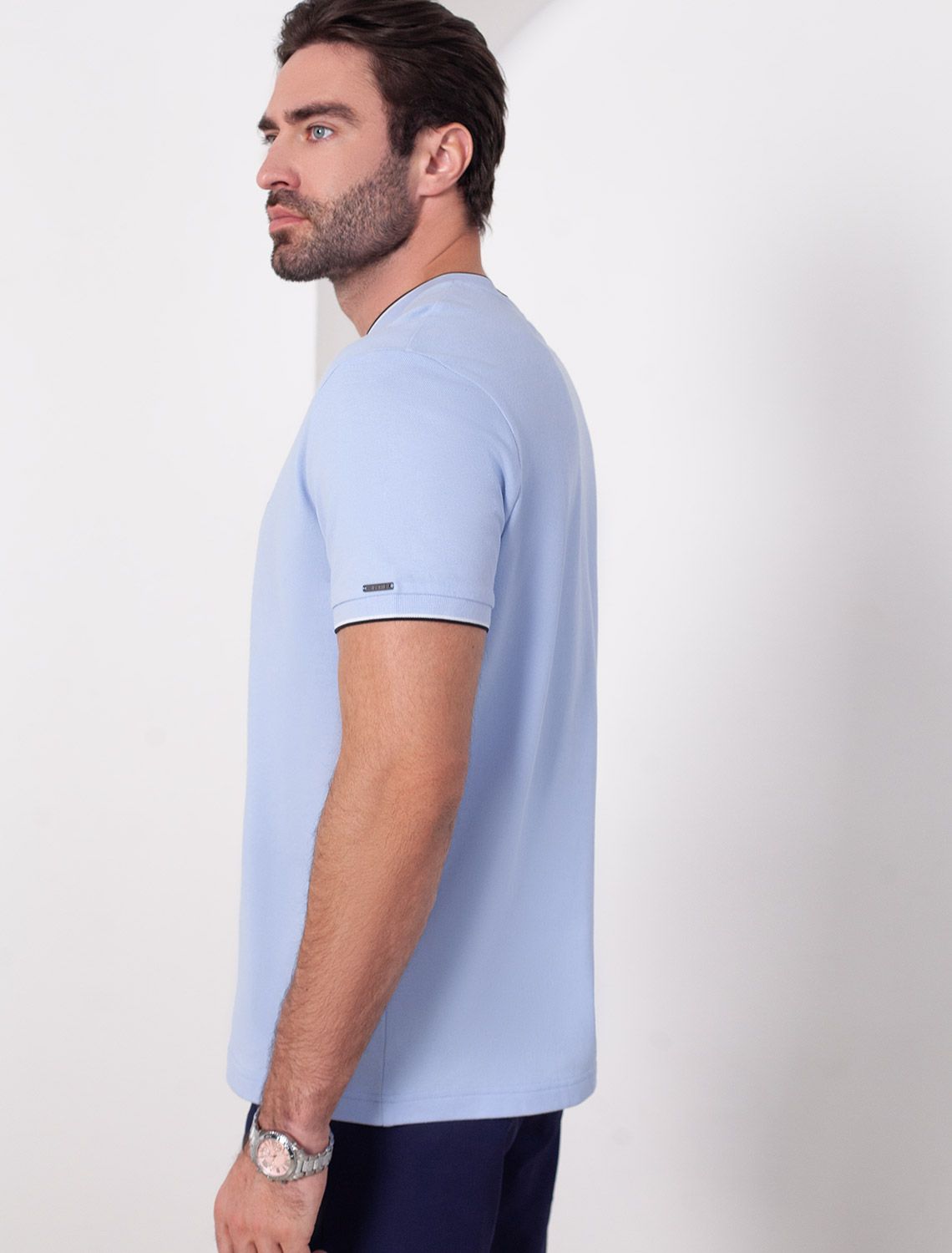 Футболка голубого цвета с аккуратным V-образным вырезом выполнена из премиального хлопка с эластаном плотностью 200 Г/м2. Высококачественный эластичный хлопок обеспечивает мягкость, воздухопроницаемость и идеальную посадку на любую фигуру и размеры, включая 58 размер. Классический прямой крой футболки подчеркивает фигуру, но не сковывает движений. Элегантный небольшой V-образный вырез с контрастной полосой визуально удлиняет шею, а минималистичная вышивка на груди в виде логотипа бренда добавляет изысканности и индивидуальности, не перегружая образ. Эта базовая футболка - идеальный баланс комфорта и стиля для современного мужчины, легко сочетается с разными низами, создавая образ от кэжуал до более элегантного. Стильная футболка подходит как для повседневной носки, так и для создания более нарядных образов.