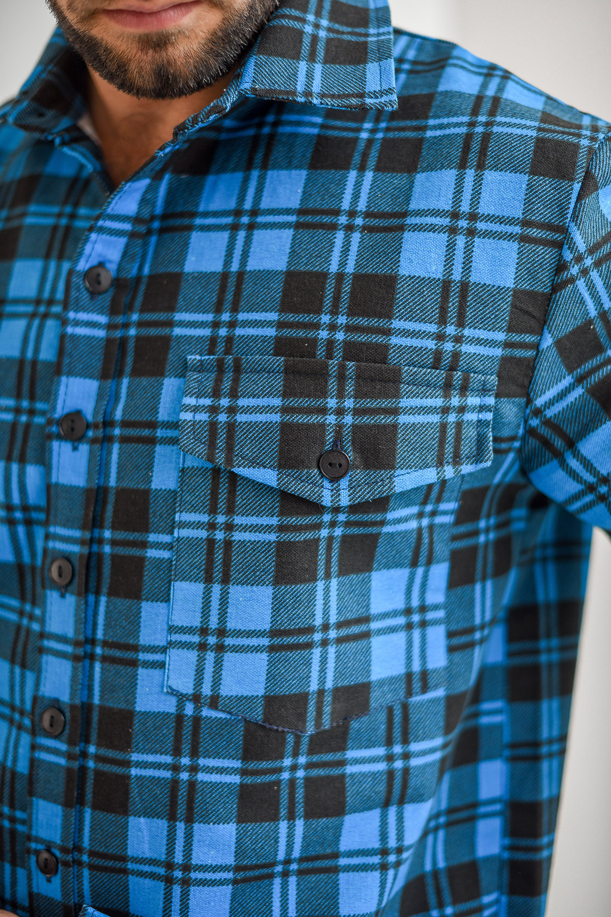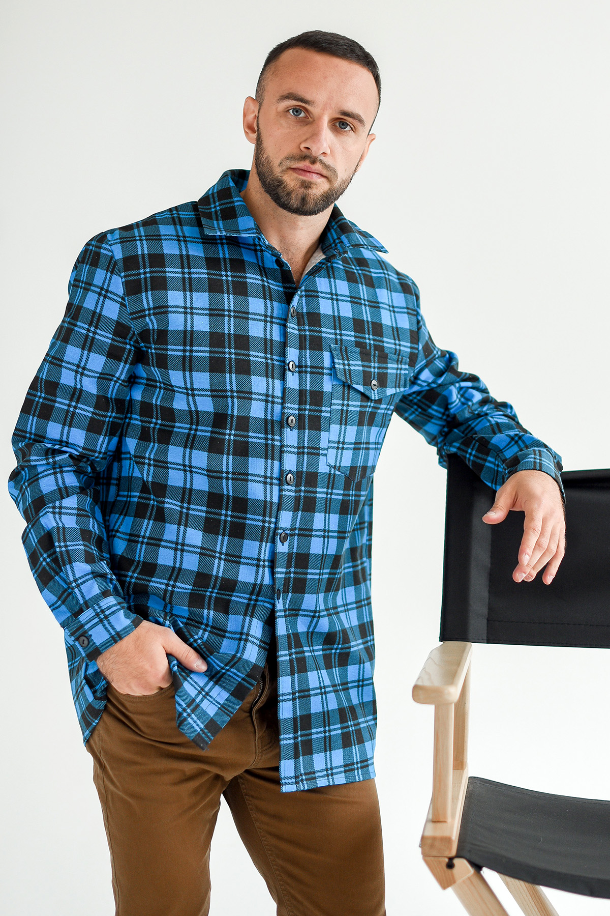 Мужская классическая сорочка из 100% хлопчатобумажной ткани – фланель, с длинными рукавами и застёжкой на петли - пуговицы. На полочке с левой стороны нагрудный накладной карман с клапаном. Рукава на манжетах. Воротник отложной с отрезной стойкой. Сорочка может быть использована как комфортная одежда для дома, так и в качестве повседневной одежды. Создать красивый стильный комплект можно дополнив сорочку трикотажной футболкой.