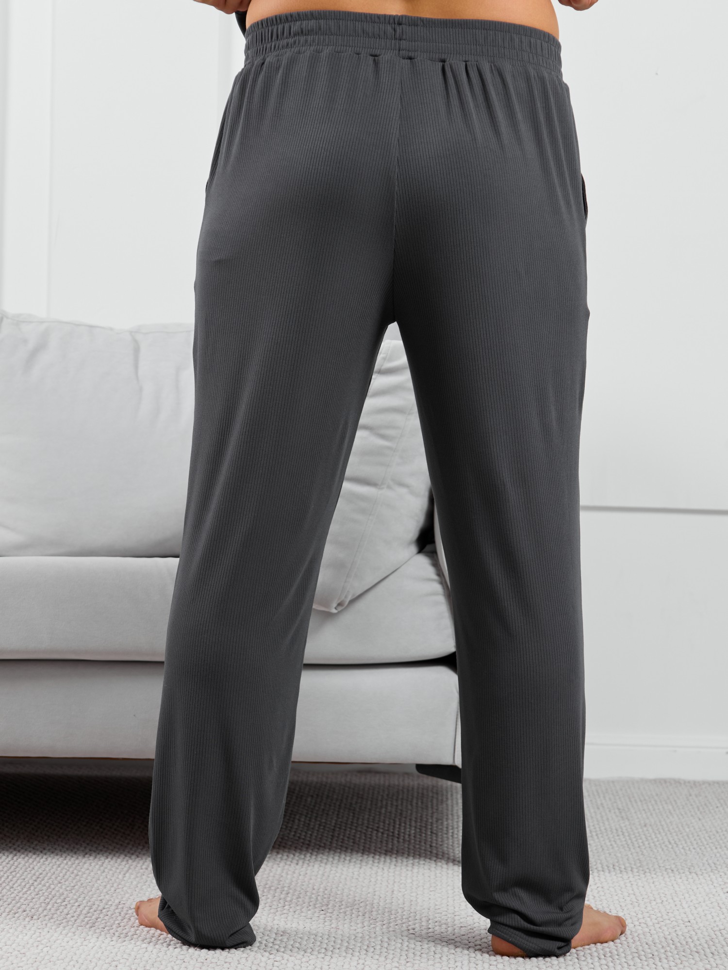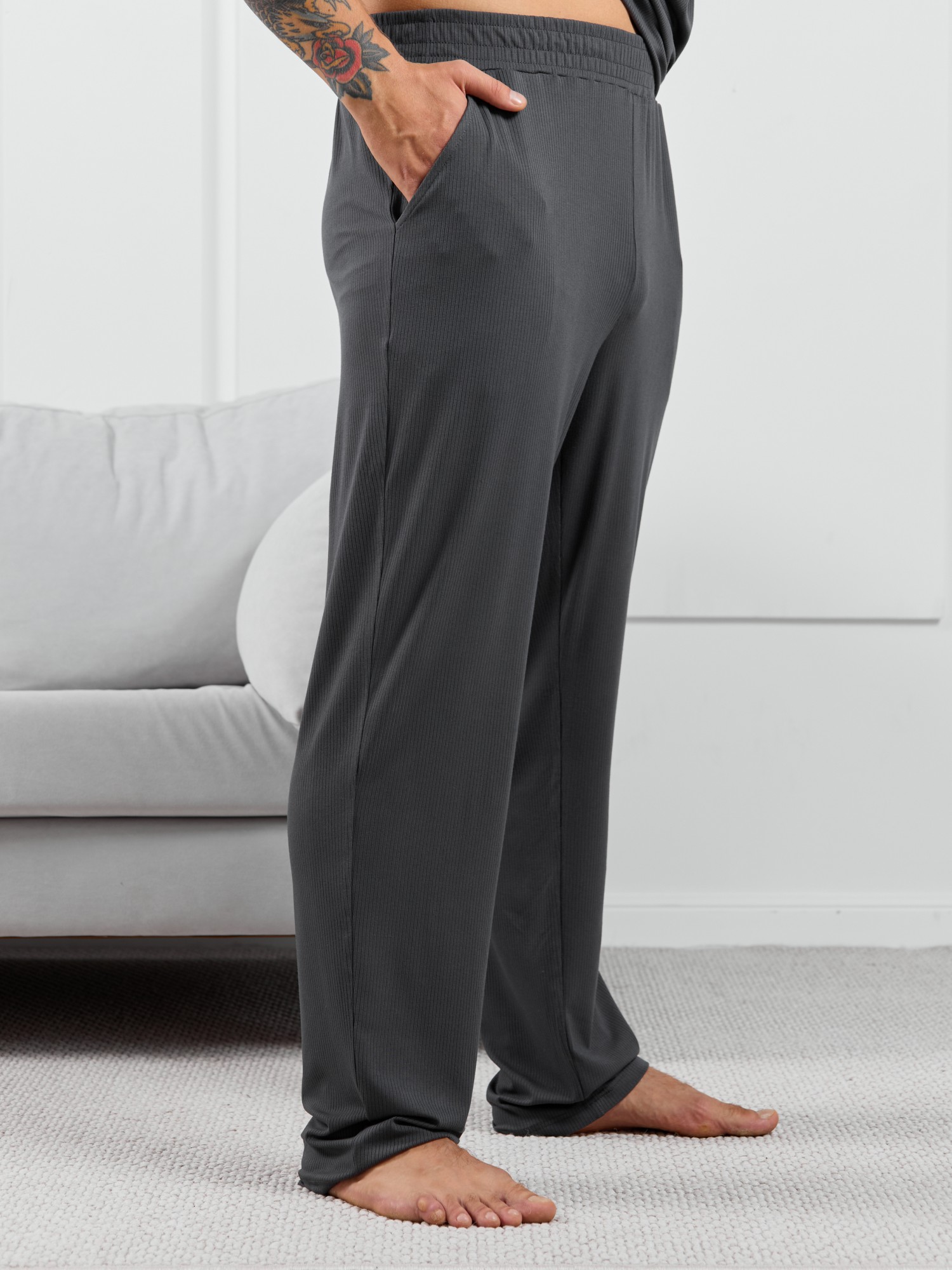 Брюки мужские из пластичного однотонного трикотажного полотна в рубчик, приятного к телу. Модель свободная, прямого силуэта, с боковыми карманами с обтачными входами, на притачном поясе с отстроченной эластичной тесьмой.