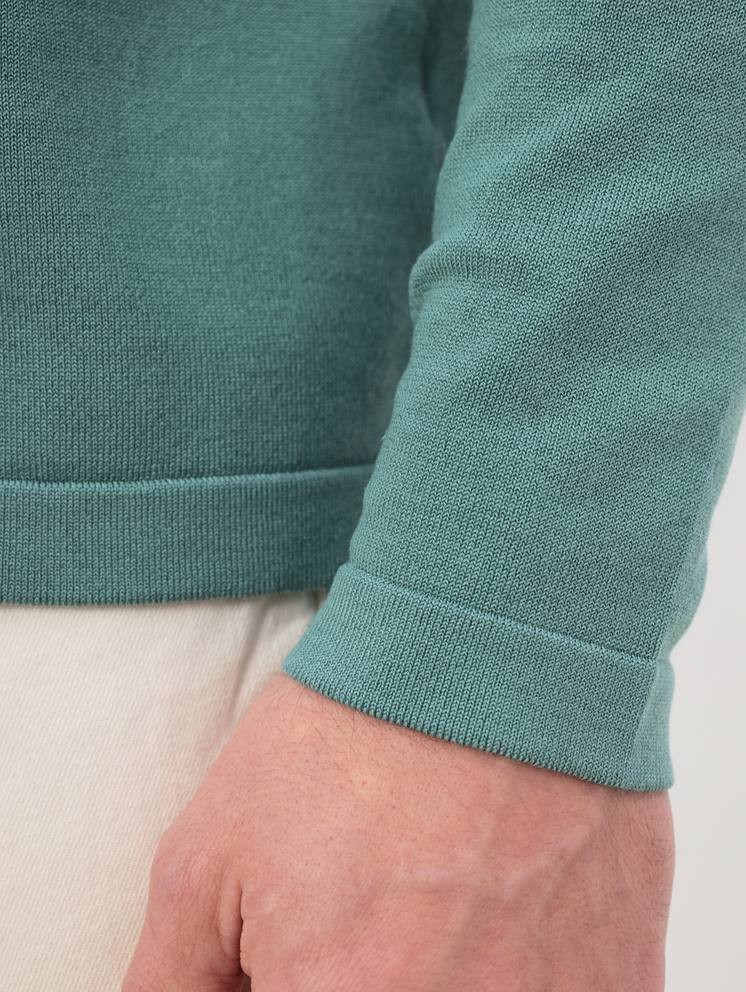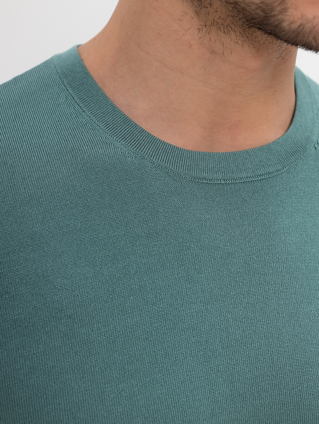 Цвет: Зеленый Рисунок: Трикотаж с..показать отделкой Состав: 95% тенсель, 5% шёлк Модель: Классическая Ворот: Круглый Силуэт: Прямой силуэт / Сlassic fit отделкой