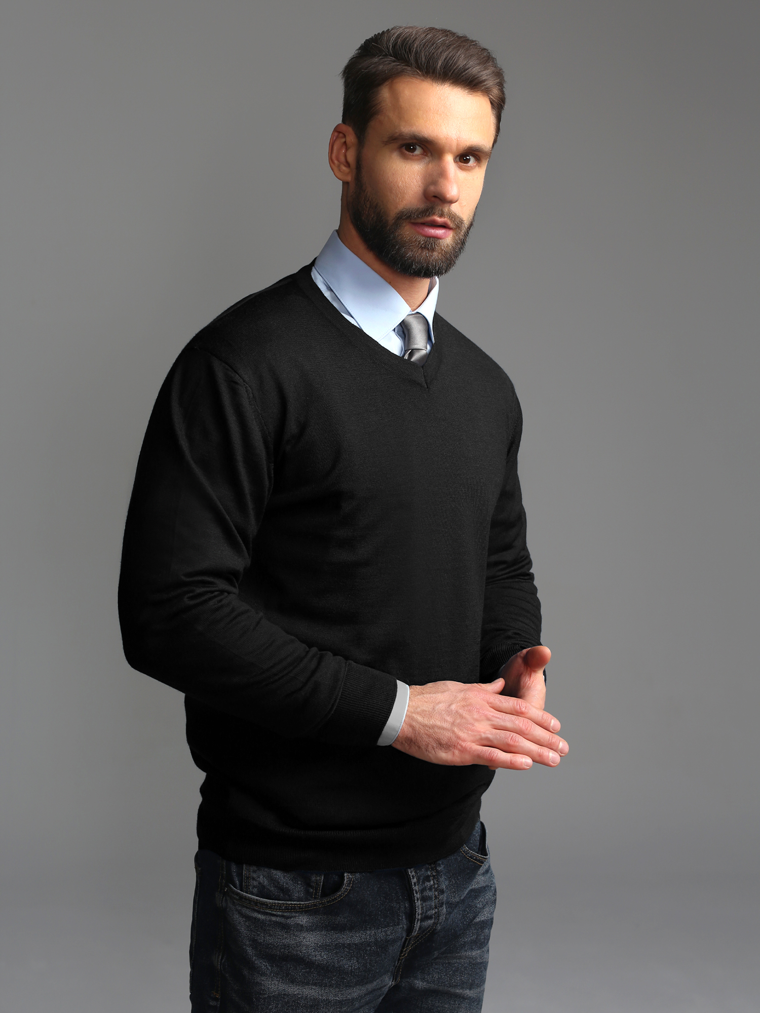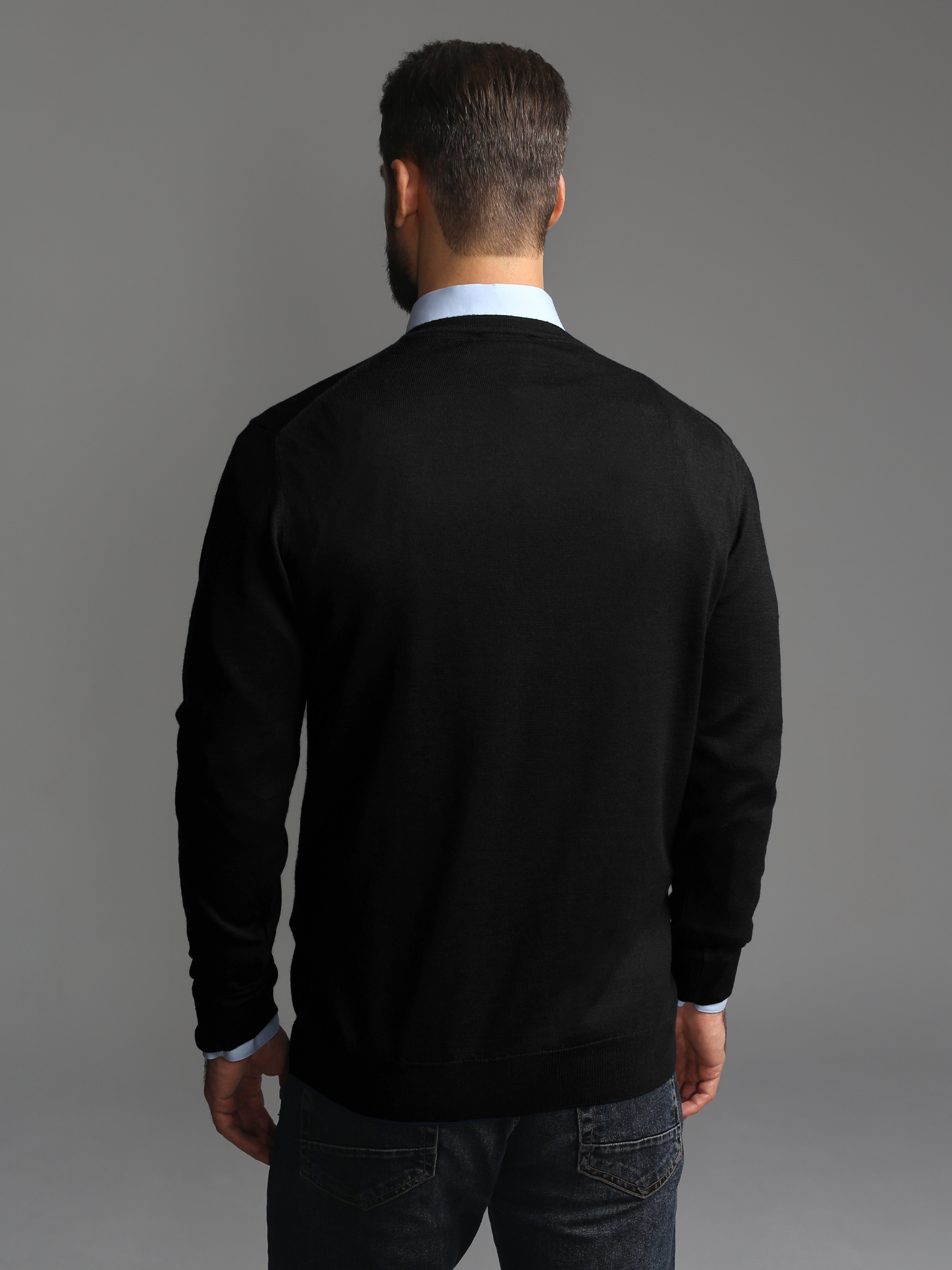 Цвет: Черный Рисунок: Трикотаж од..показатьнотонный Состав: 80% шерсть мериноса 20% акрил Модель: Классическая Ворот: V-вырез Караман: отсутствует Силуэт: Прямой силуэт / Сlassic fitнотонный