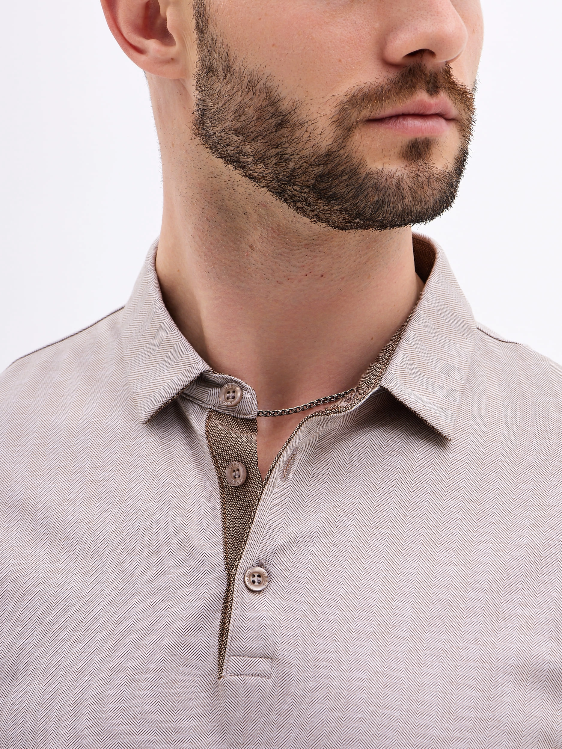 Цвет: Бежевый Рисунок: Елочка..показать> Состав: 100% хлопок Non Iron Модель: Классическая с разрезами по бокам Ворот: Из основной ткани на стойке Караман: отсутствует Отделка: Поло-внутренняя стойка,нижняя планка,обтачка верхней планки и нижний воротник из ткани компаньона>