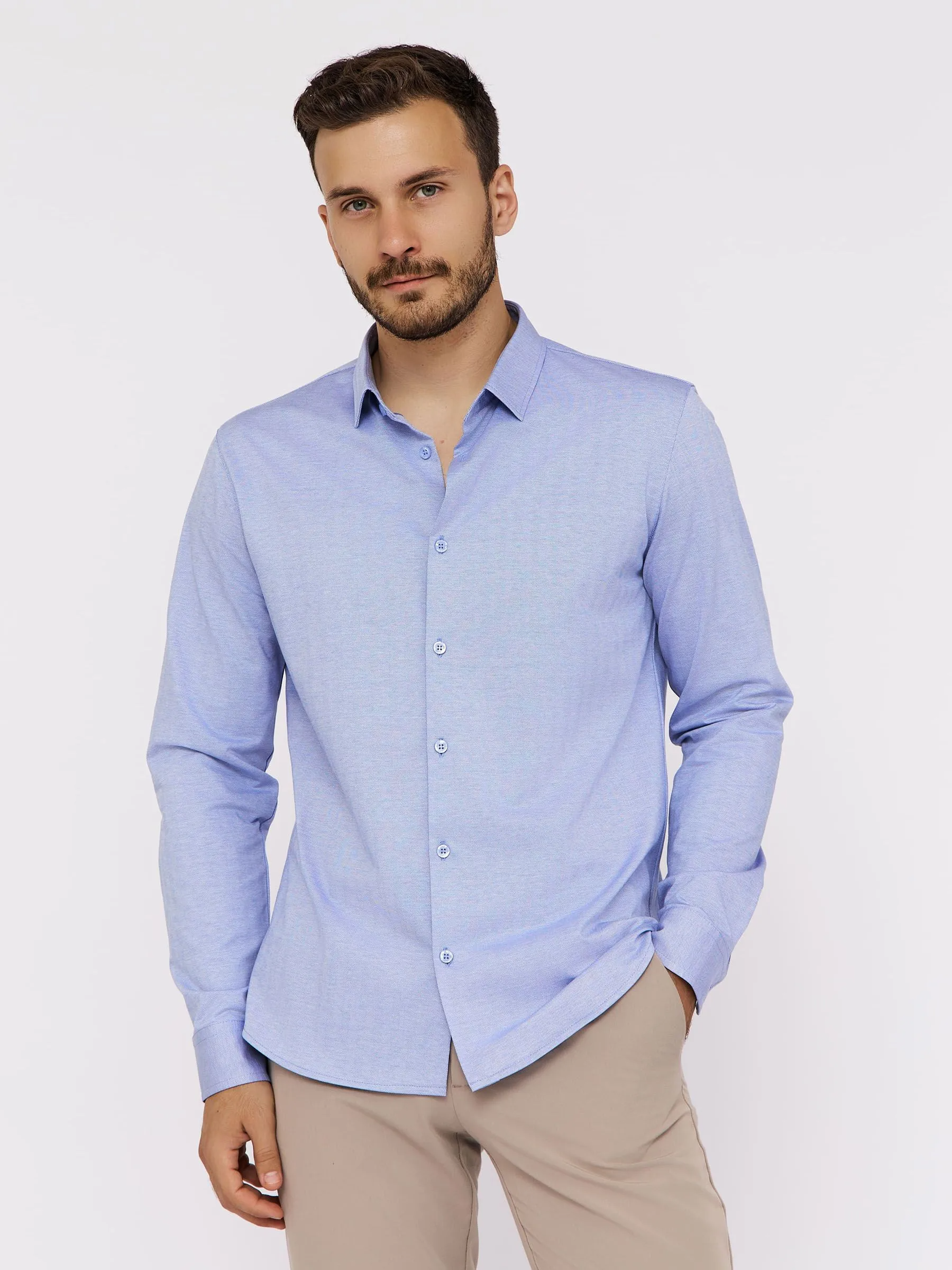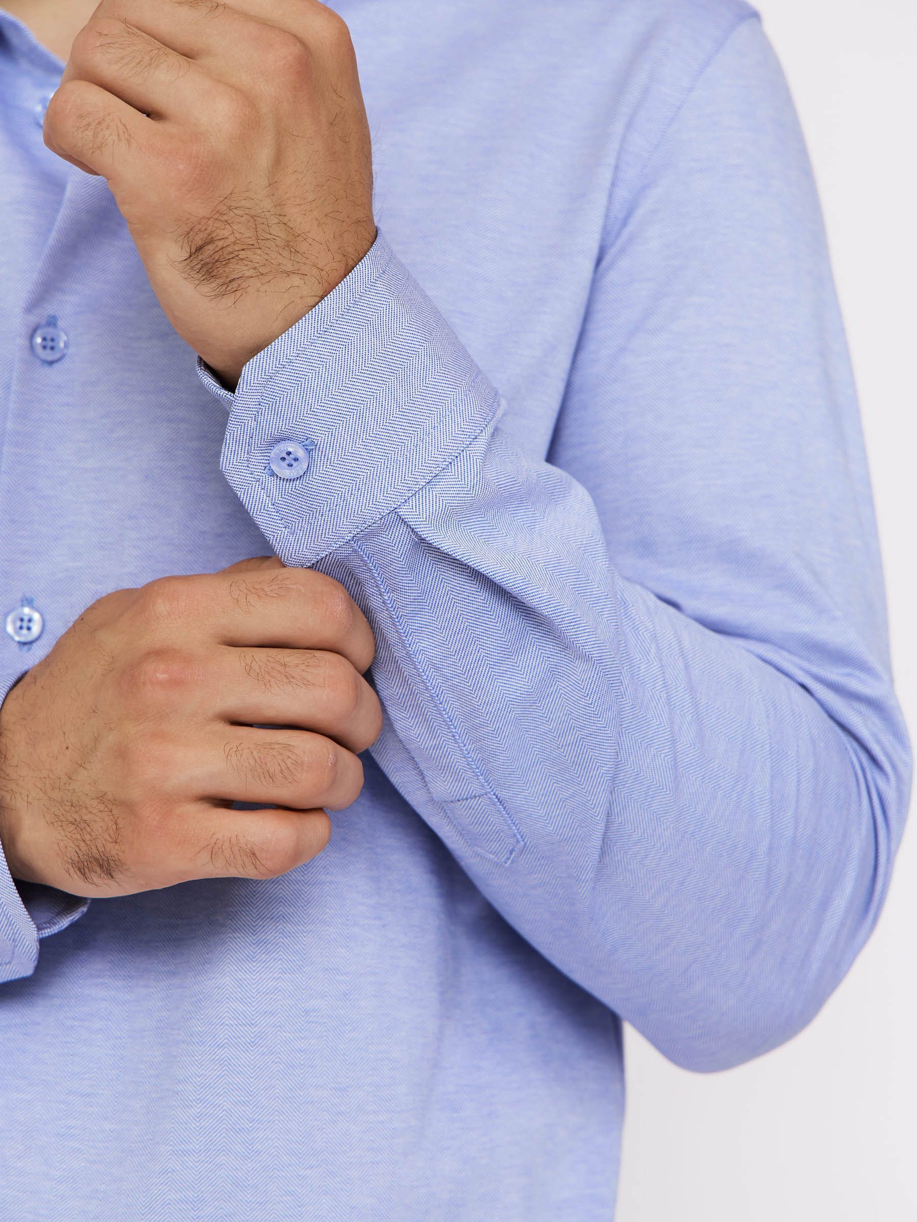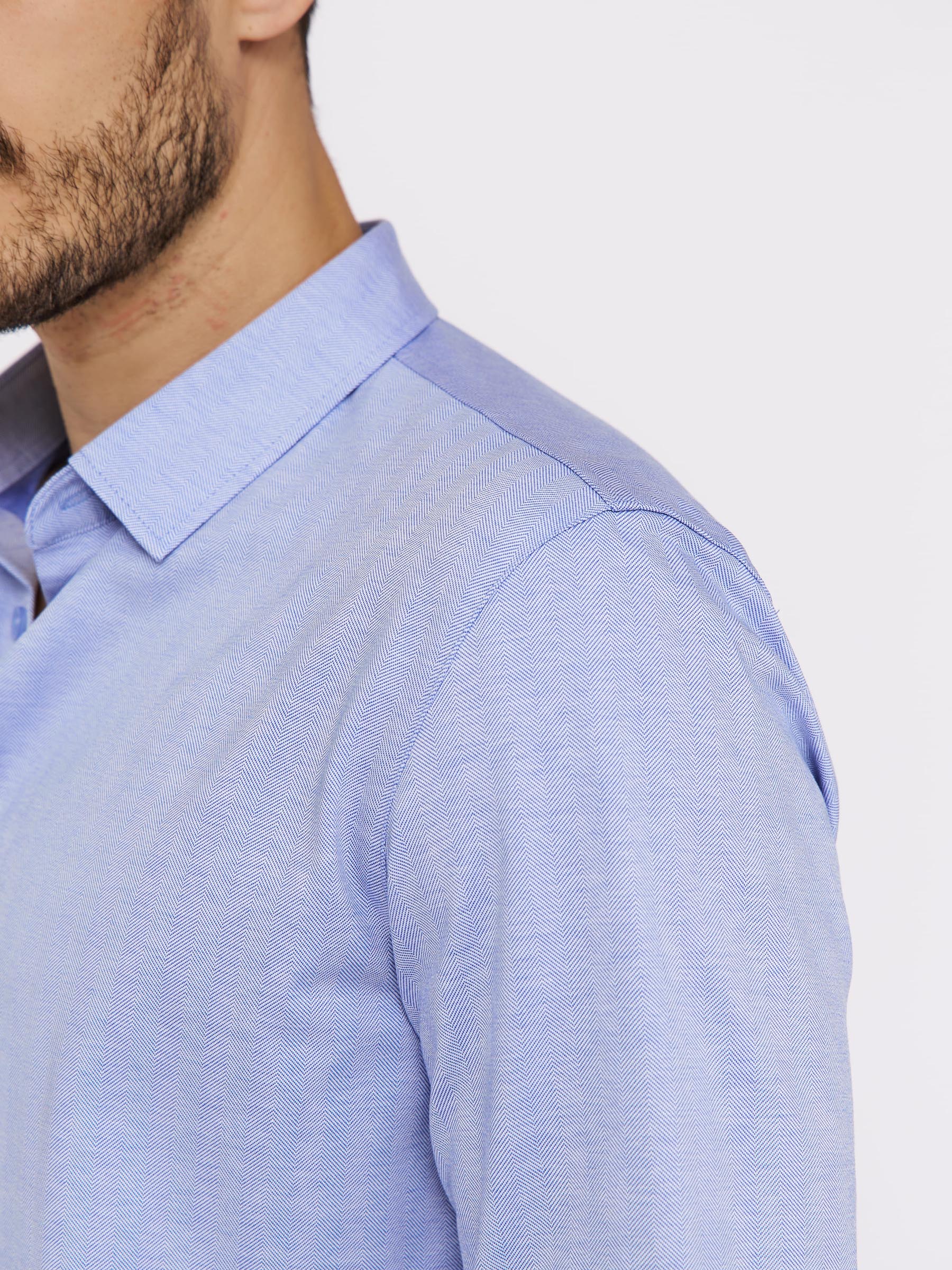 Цвет: Голубой Рисунок: Елочка..показать> Состав: 100% хлопок Non Iron Модель: Прилегающая Ворот: Немецкий мягкий Караман: отсутствует Манжет: классический с двумя срезами на пуговицах 6 см Силуэт: Прилегающий силуэт / Casual Slim fit>