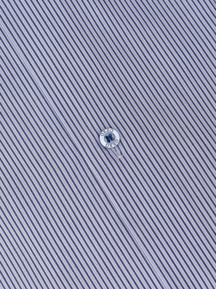 Цвет: Голубой Рисунок: Полоска..показатьi> Состав: 100% хлопок Non Iron Модель: Зауженная Ворот: Немецкий Караман: отсутствует Силуэт: Полуприталенный силуэт / Regular fit Отделка: Сорочки- тесьма по нижнему краю внутренней стойки воротникаi>