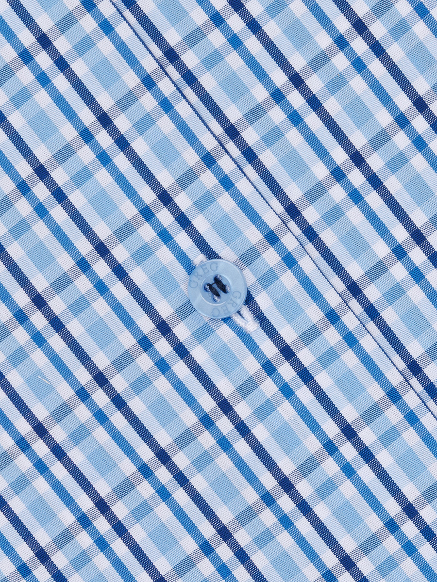 Цвет: Голубой Рисунок: Клетка..показать> Состав: 100% хлопок Easy Care Модель: Зауженная Ворот: Немецкий Караман: отсутствует Силуэт: Полуприталенный силуэт / Regular fit Отделка: Сорочки- внутренняя стойка воротника из ткани компаньона>