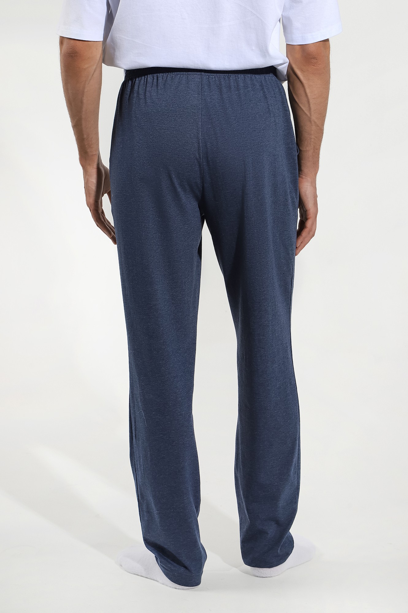 Брюки мужские из меланжированного трикотажного полотна "кулирка", прямого силуэта, с карманами в боковых швах, на притачном поясе с эластичной тесьмой внутри. В центре пояса - две обметанные петли , через которые продет шнурок для регулирования степени прилегания шорт по талии.