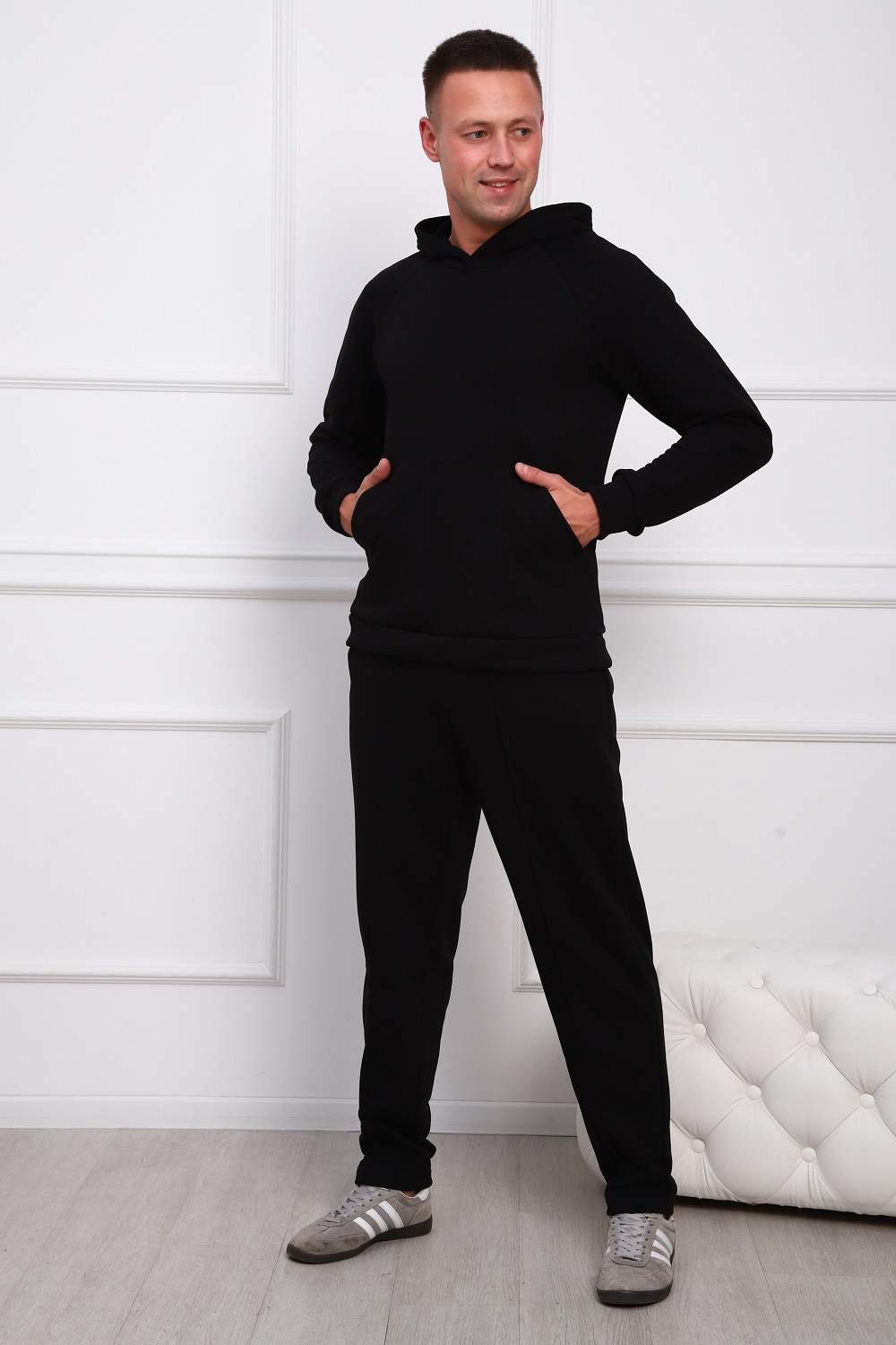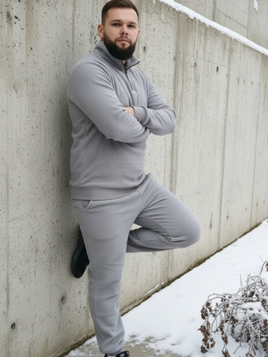 Костюм мужской: толстовка с брюками. Толстовка с карманом-кенгуру и с капюшоном. Рукава - реглан, на манжетах. Брюки на эластичном поясе, с боковыми карманами, с манжетами по низу брючин. Материал - плотный премиальный трикотаж с высоким содержанием хлопка (60%).