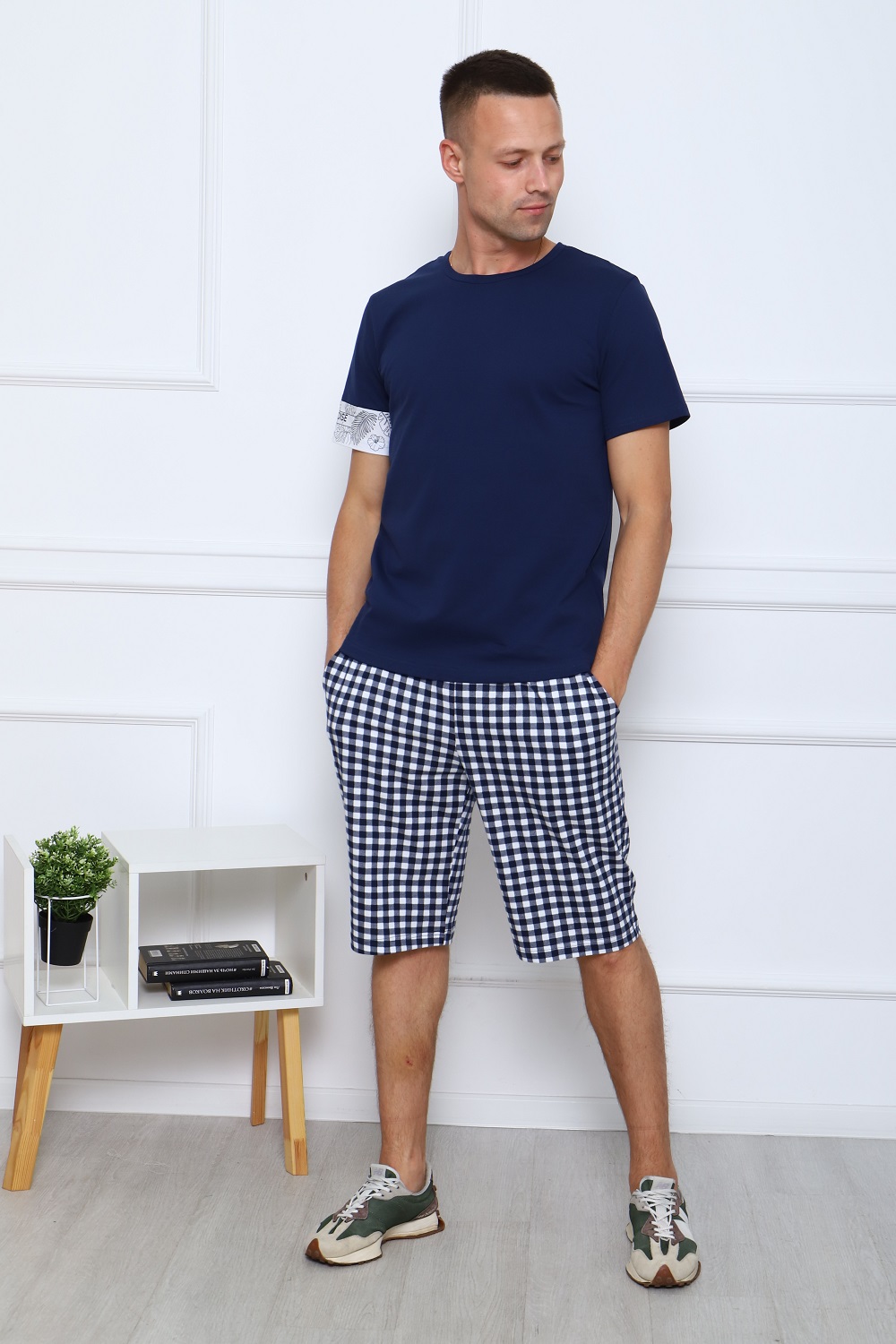 Костюм мужской: футболка с короткими рукавами, на правом рукаве стильный декор с печатью, шорты до колена, на широком эластичном поясе, с удобными боковыми карманами.