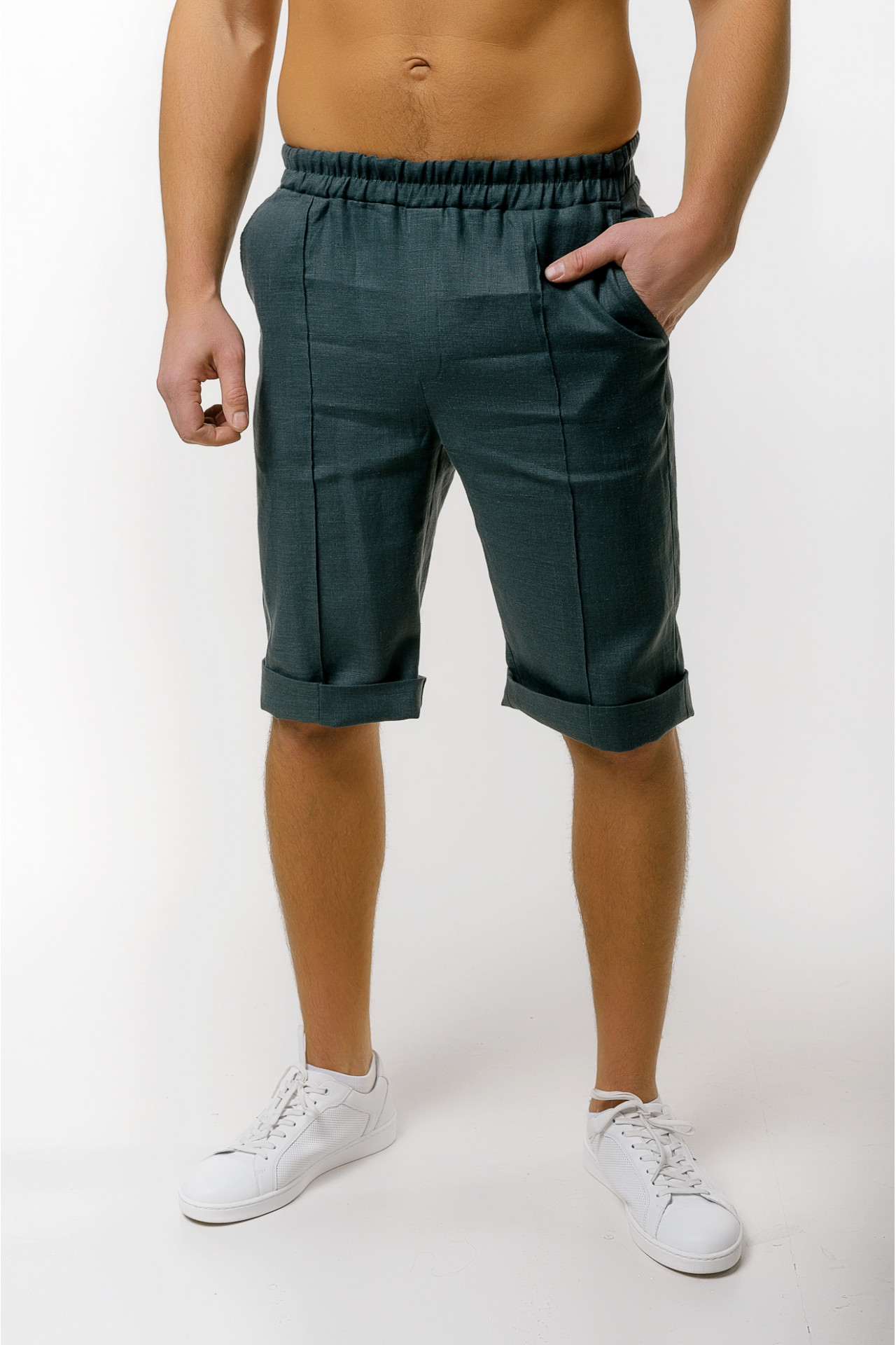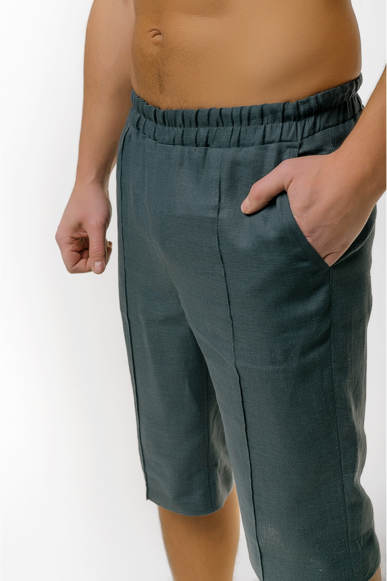 Мужские льняные капри. Пояс на резинке, на задней половинке имитация кармана «в рамку».