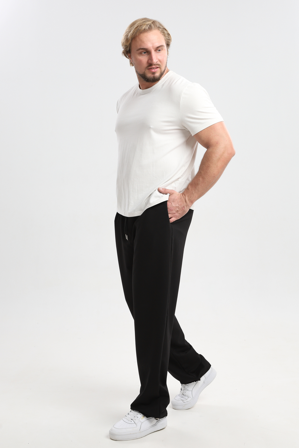 Мужские спортивные брюки прямого кроя - удобная модель для активного образа жизни, тренировок, прогулок и повседневной носки. Эластичный пояс со шнурком регулирует посадку, обеспечивая надежную фиксацию без давления. Благодаря такому крою штаны хорошо сидят на любой фигуре, подчеркивая силуэт и обеспечивая свободу движений. Универсальный фасон подходит для спорта, отдыха, прогулок и работы. Лаконичный дизайн без лишних деталей делает модель практичной на каждый день. Брюки легко комбинируются с разными стилями, оставаясь удобными и функциональными в любой ситуации. Цвет: черный; Материал: футер 2-х нитка;футер 2-х нитка; Состав: 72% хлопок, 20% полиэстер, 8% эластан.