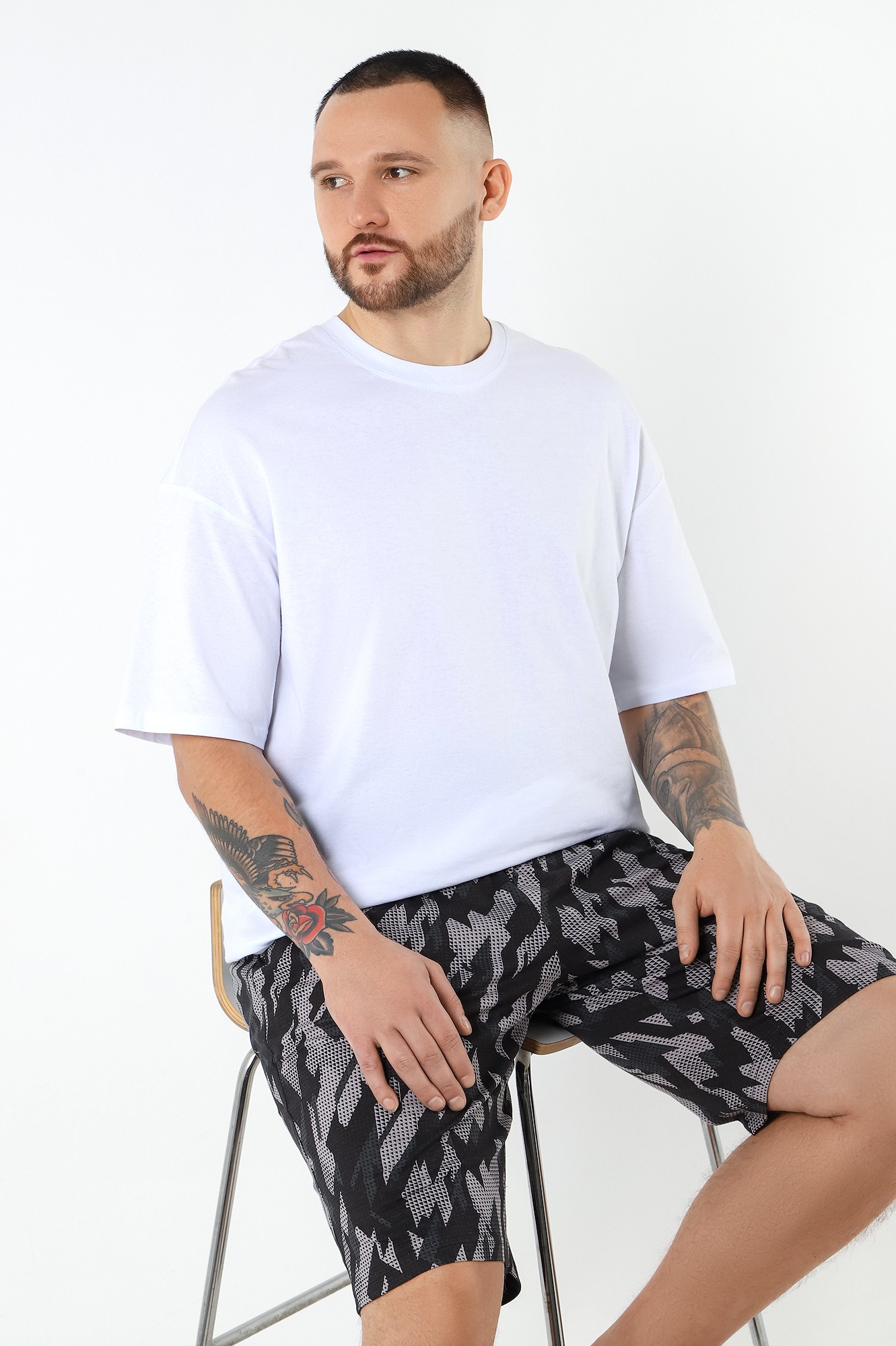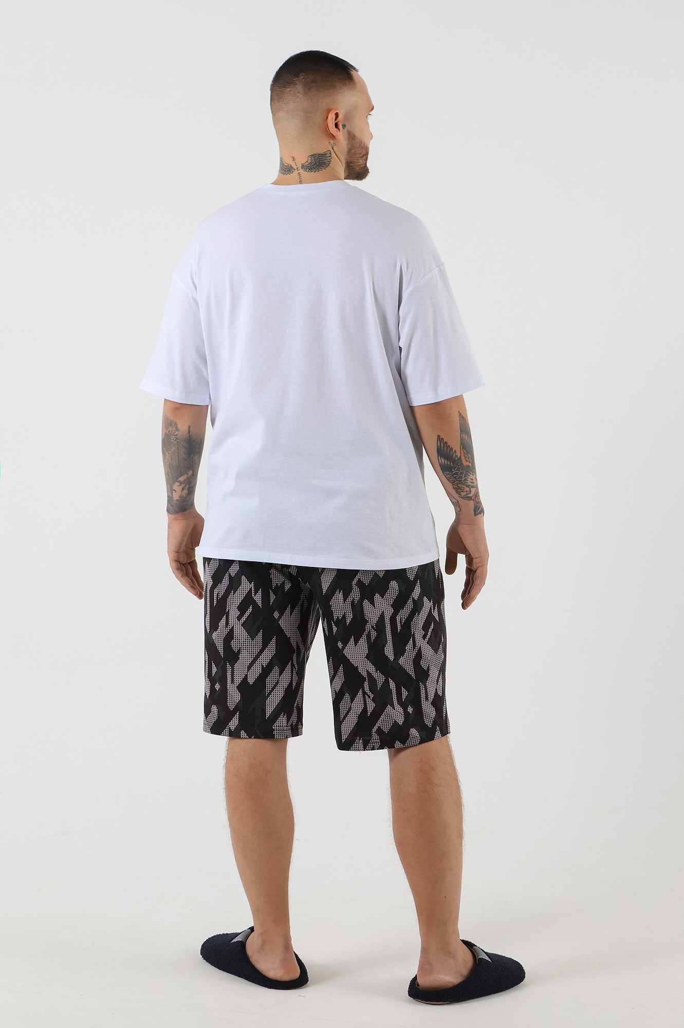 Шорты мужские из трикотажного полотна "кулирка" с набивным рисунком, удлиненные, на притачном поясе с эластичной тесьмой внутри, с карманами в боковых швах, входы в которые окантованы основным материалом.