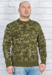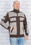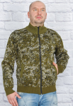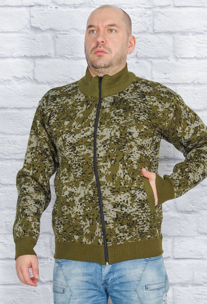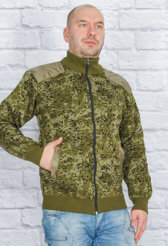 Вязаная кофта на молнии камуфляжной расцветки. Воротник-"стойка", рукава и низ изделия на манжетах, по бокам - карманы.