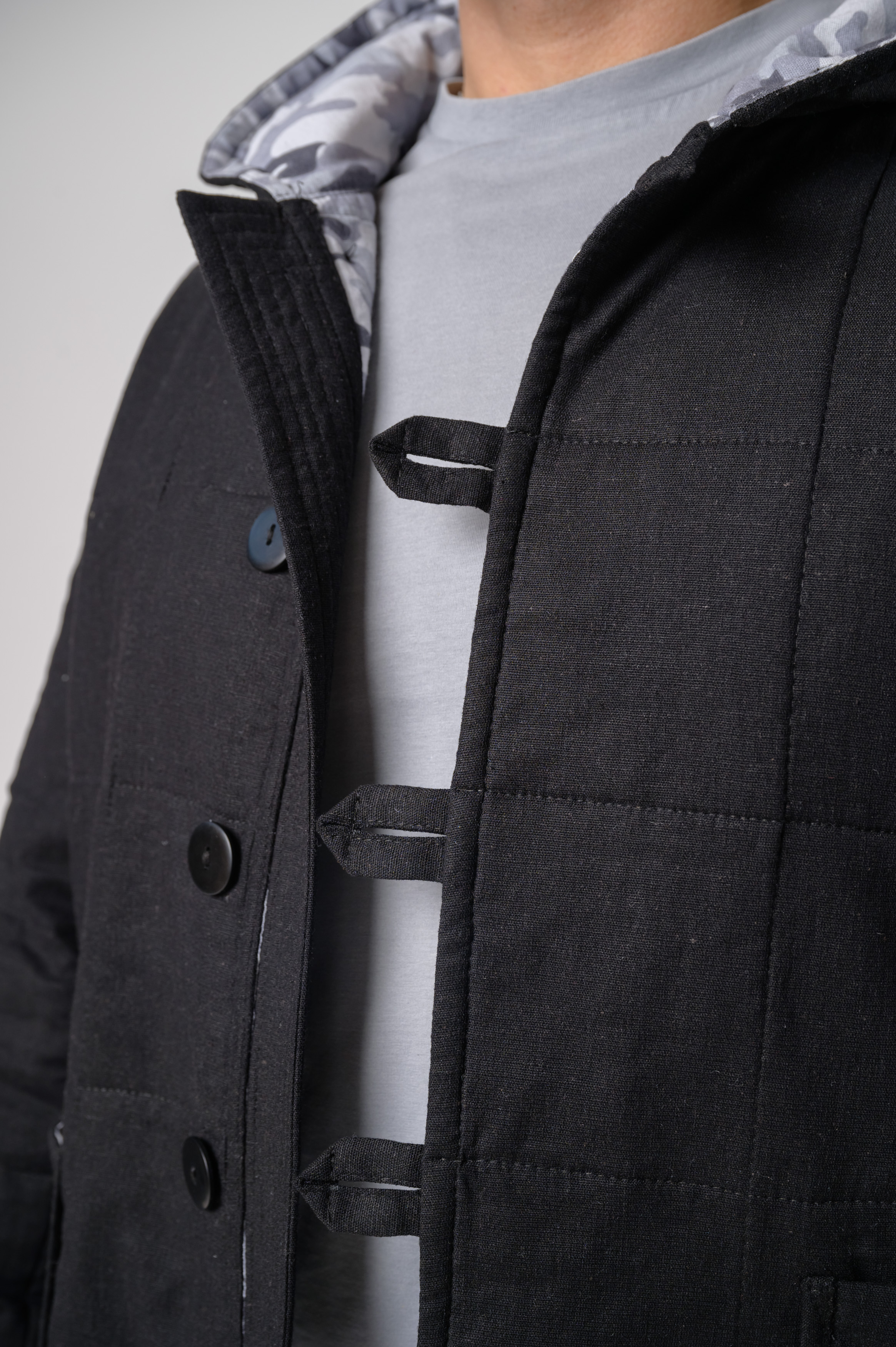 Мужская льняная классическая куртка с капюшоном на натуральном утеплителе (100% хлопок). Застежка на навесные петли и пуговицы. Изделие выстегано, подкладка куртки выполнена из натурального хлопка. Низ рукава возможно подворачивать в виде манжета. Имеются 2 накладных кармана. Вещь легка в эксплуатации, стирается в домашних условиях, не требует дополнительных средств ухода.