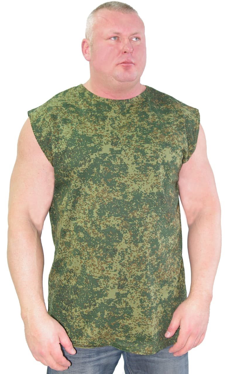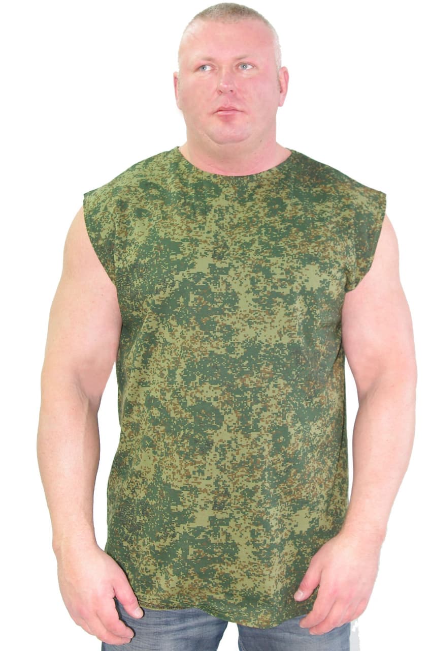 Майка камуфлированная больших размеров  4-х цветная, двухстороннее активное крашение. В производстве используется трикотаж, кулирное полотно, плотностью 150 г/м2, состав 100% хлопок.