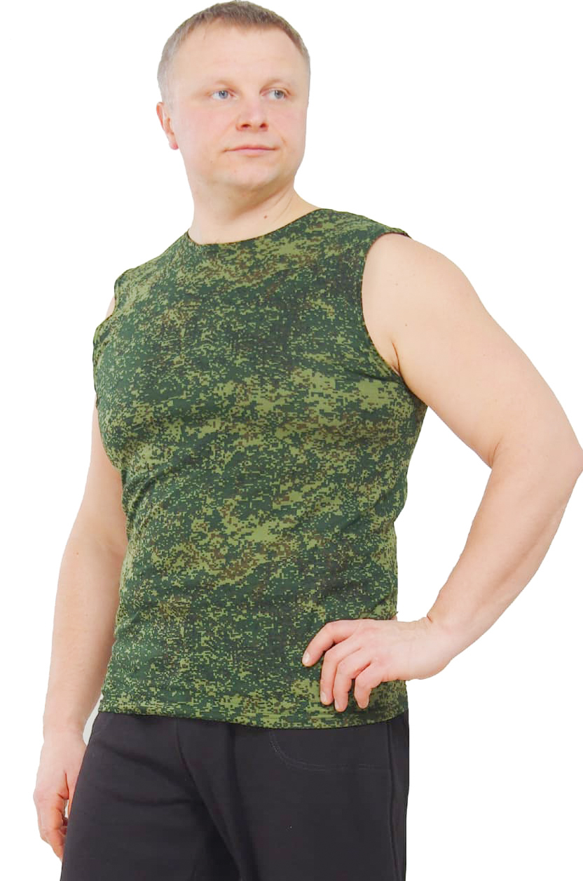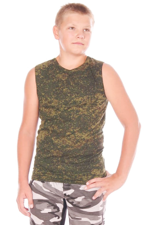 Майка камуфлированная, выполнена из 4-х цветного кулирного полотна, двухстороннего активного крашения, плотностью 150 г/м2, составом 100 % хлопок.