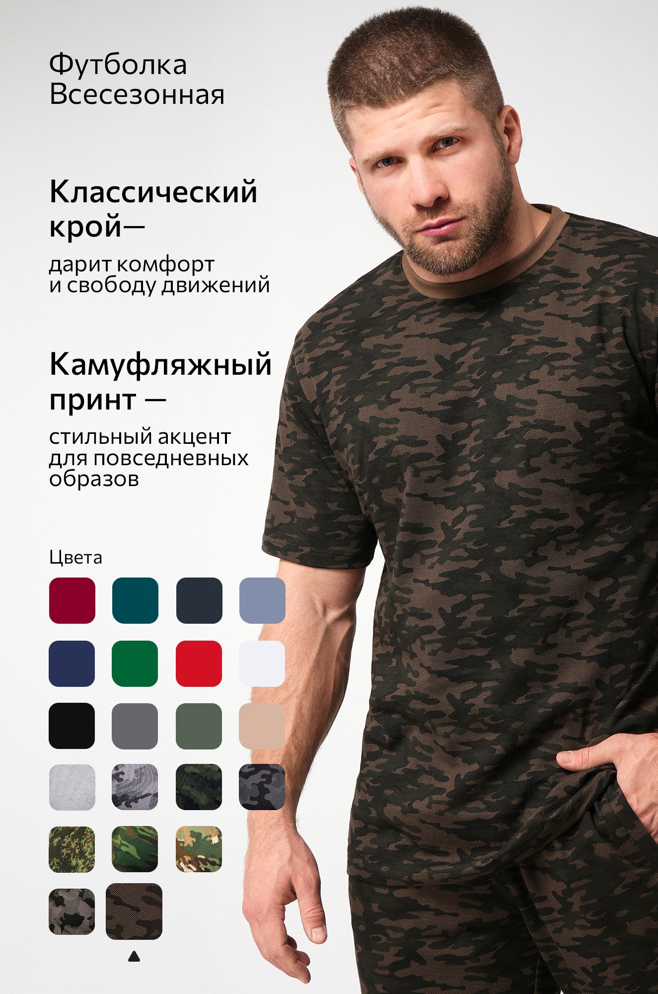 Тактическая футболка идеальна для походов, рыбалки, охоты и туризма. Хлопковая трикотажная ткань приятна на ощупь и дарит комфорт на каждый день. Мужская футболка представлена в цвете хаки с рисунком камуфляж.