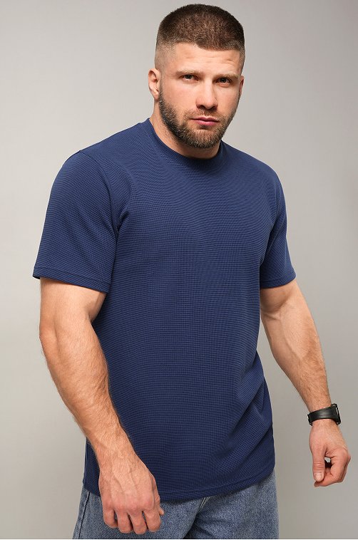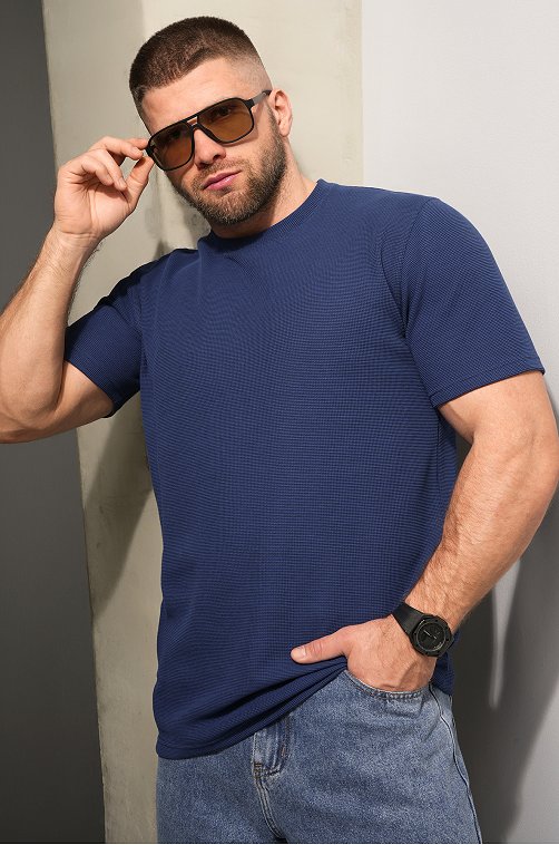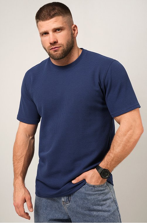 Мужская базовая футболка — идеальная основа гардероба. Вафельная футболка выглядит стильно за счёт фактурного трикотажа и отлично вписывается в кэжуал образы. Синяя футболка для мужчин сочетает комфорт, практичность и минимализм.