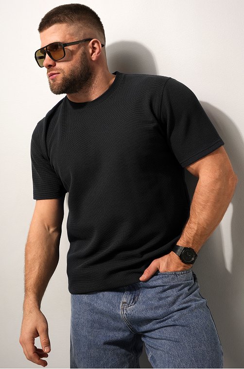 Мужская базовая футболка — идеальная основа гардероба. Вафельная футболка выглядит стильно за счёт фактурного трикотажа и отлично вписывается в кэжуал образы. Черная футболка для мужчин сочетает комфорт, практичность и минимализм.
