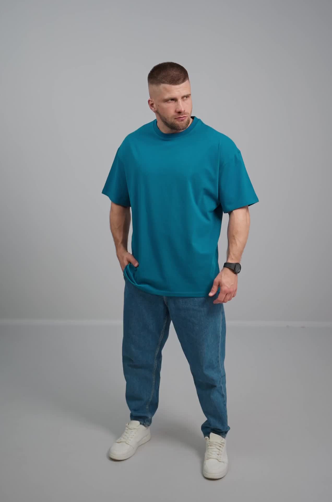 Мужская базовая футболка оверсайз станет отличной основой для образов в уличном стиле. Плотная хлопковая футболка оттенка морской волны — прекрасное решение для активного отдыха.