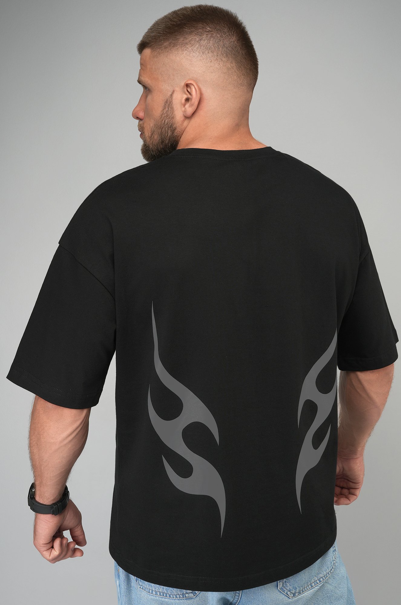 Чёрная мужская футболка оверсайз с эффектным серебристым принтом пламя — выбор для тех, кто любит сочетать комфорт и выразительные детали. Хлопковая трикотажная ткань мягко прилегает к телу и отлично подойдёт на каждый день.