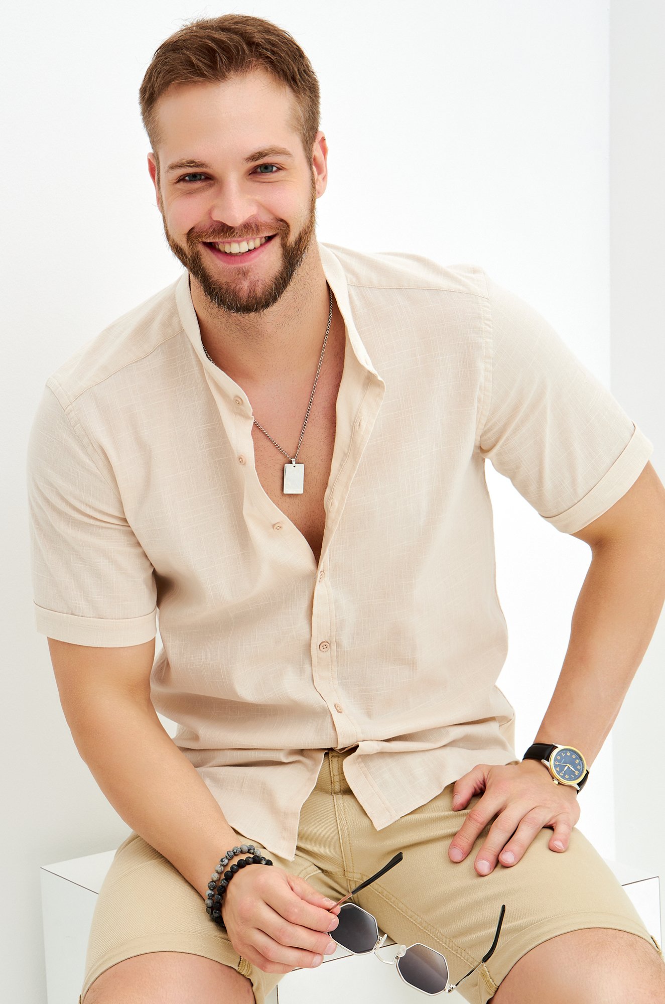 Мужская рубашка выполнена из хлопка и льна – идеальный вариант для летних кэжуал-образов! Базовый бежевый цвет, застежка на классические пуговицы и короткие рукава в сочетании с воротником-стойкой превратят каждый образ в брутальный и лаконичный.