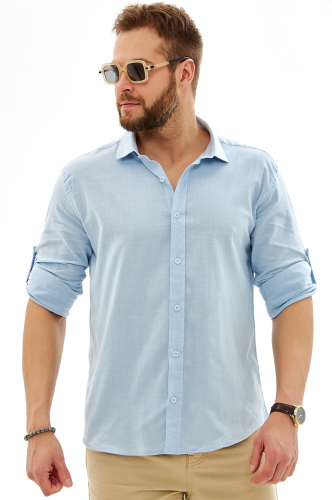 Льняная рубашка для мужчин выполнена из турецкой хлопковой ткани с добавлением льна. Короткий рукав делает рубашку приталенного кроя идеальной для лета. Воротник-стойка добавляет образу харизмы.
