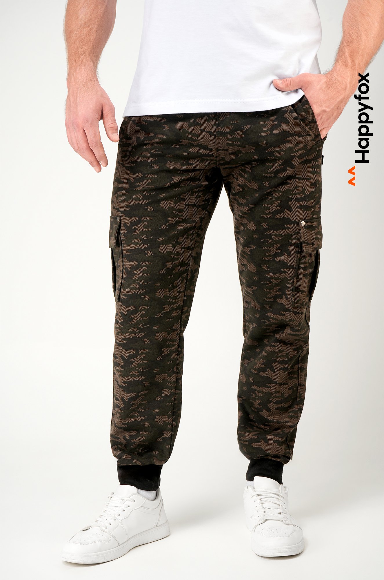 Камуфляжные брюки джоггеры — отличное решение для любителей охоты, рыбалки и туризма. Благодаря добавлению полиэстера мужские брюки из футера двухнитки мягкие и прочные, что делает их идеальным выбором для дачи и активного отдыха на природе. Трикотажные спортивные штаны выполнены в защитном цвете хаки с рисунком в стиле милитари.