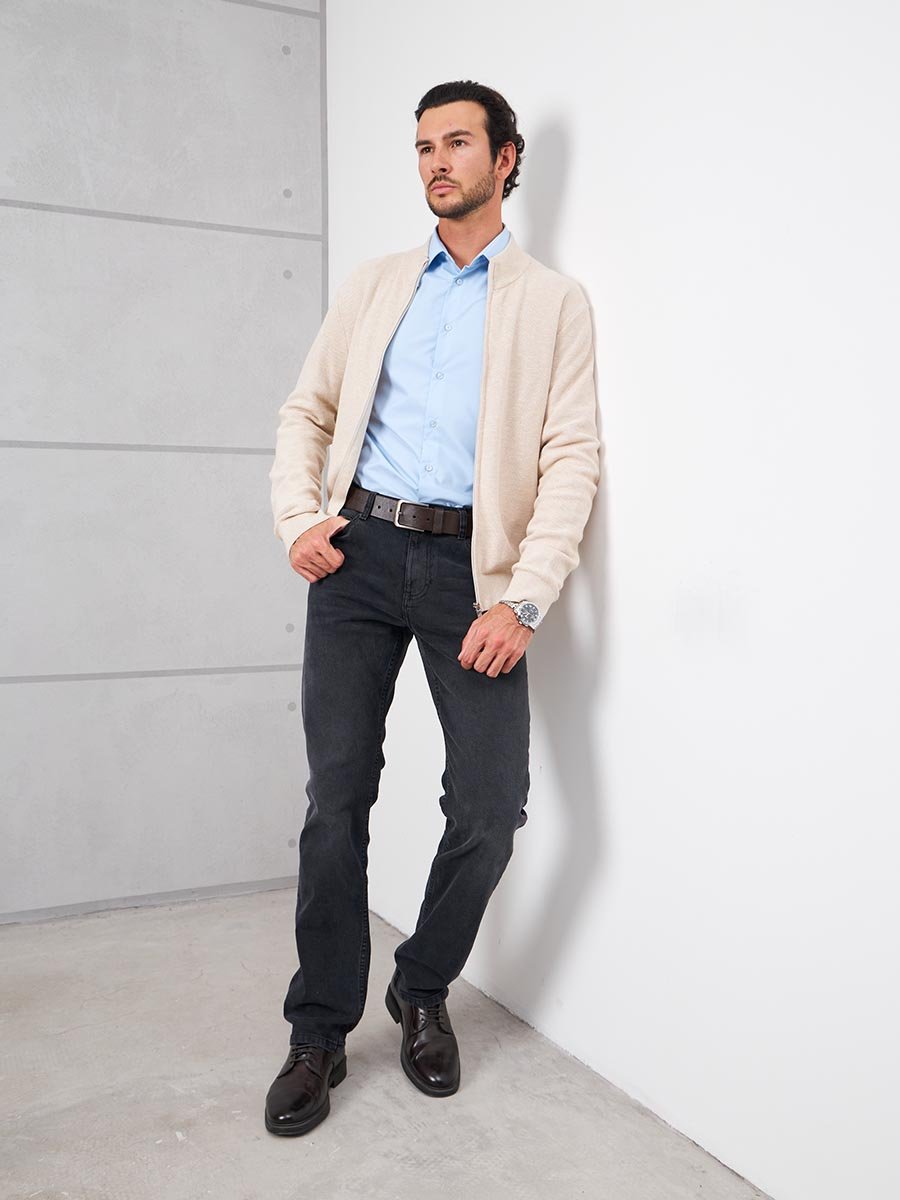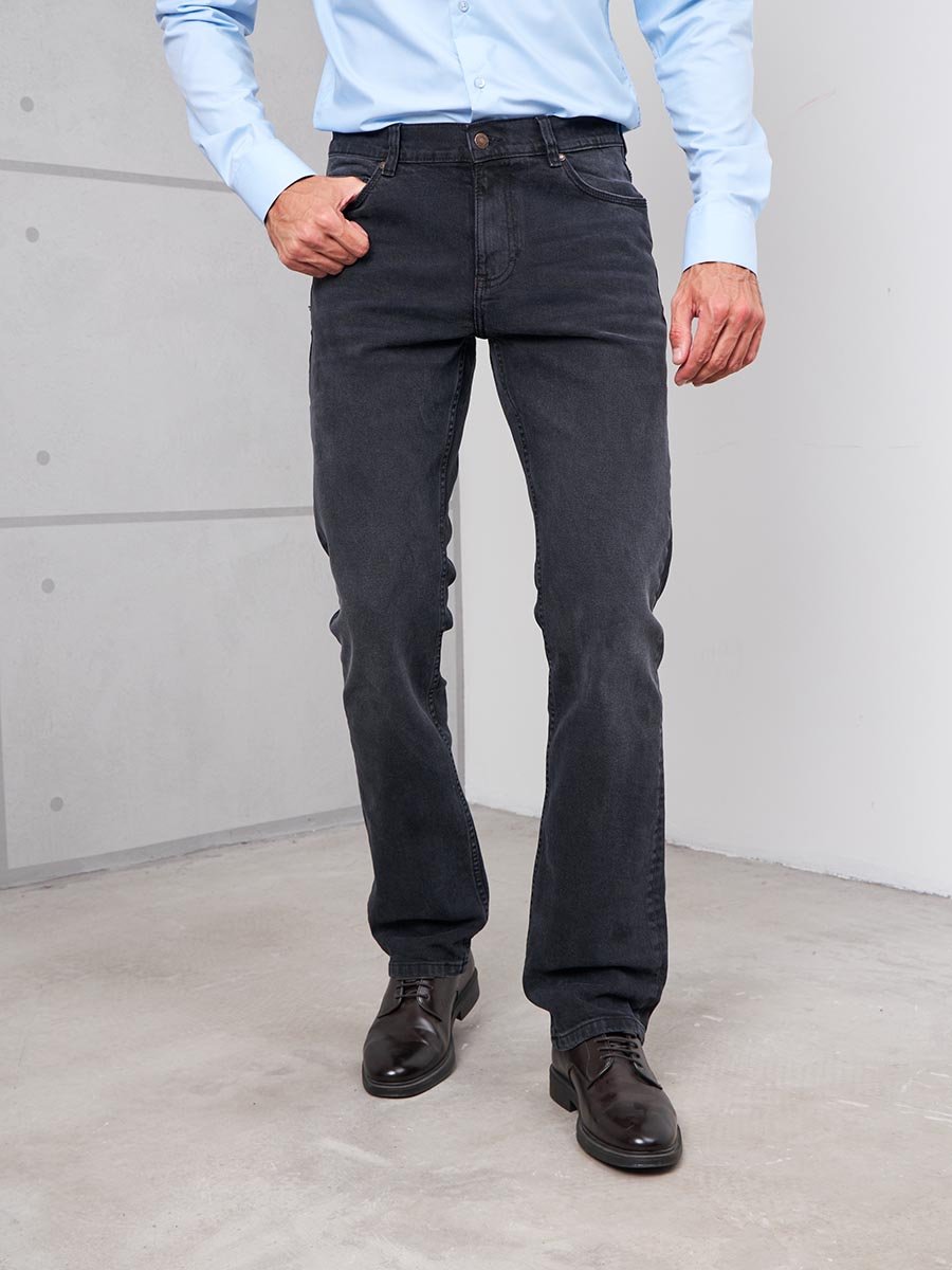 Мужские модные джинсы с пятью карманами. Посадка Slim fit (облегающие по бедру), средняя талия спереди, высокая сзади. Застежка на молнии. Немного зауженные к низу. Боковой шов сделан в разутюжку. Выполнены из слабоэластичной ткани denim comfort stretch, цвет ткани Black/Black (лицевая и изнаночная стороны ткани черные). Средняя стирка с потёртостями и "усами" спереди и потёртостями сзади. Основной  оттенок  ткани после стирки темно-серый.