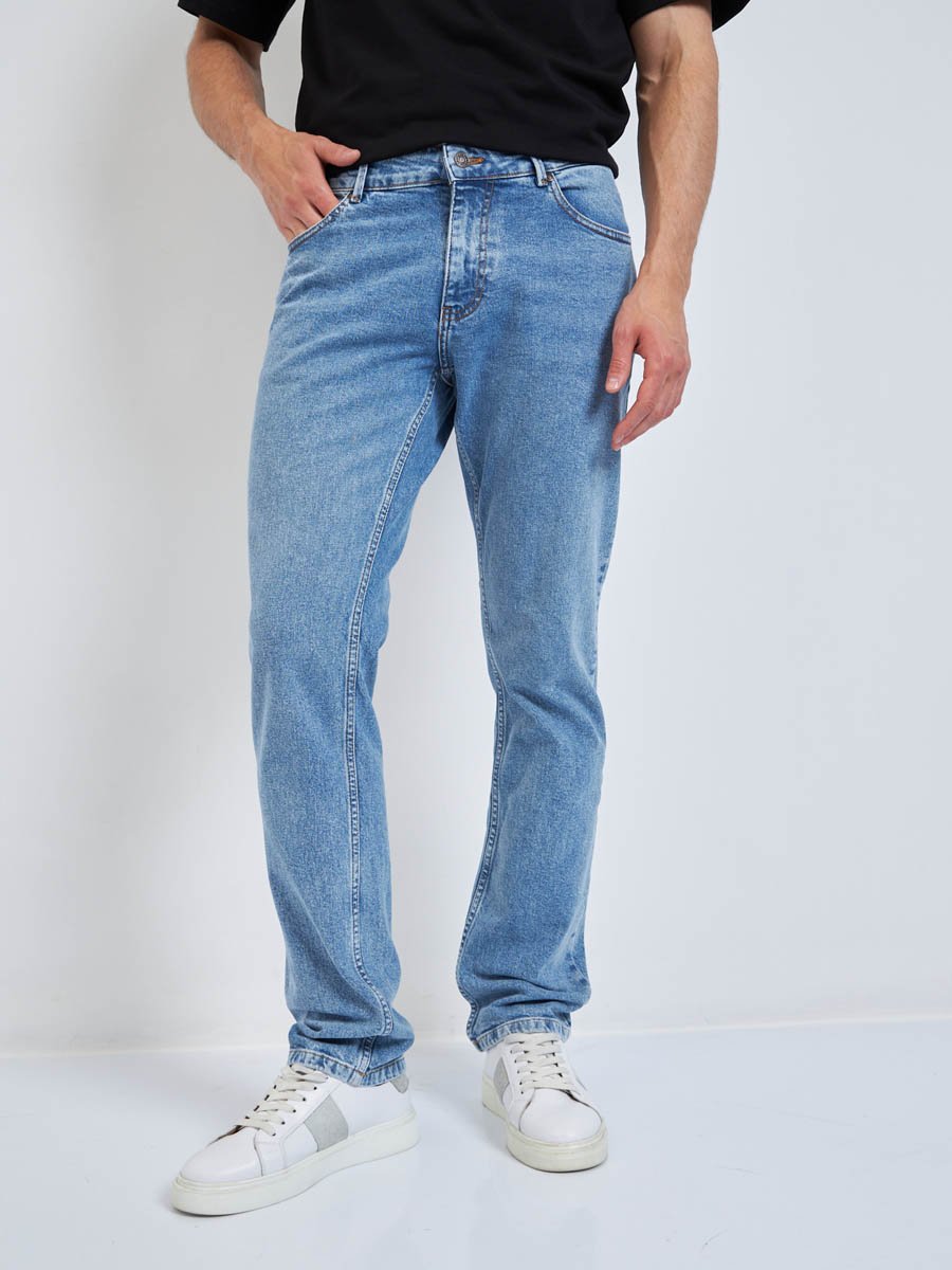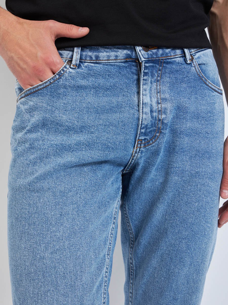 Мужские стильные джинсы с пятью карманами. Задние карманы оригинального дизайна. Посадка Regular fit (полуоблегающие  по бедру). Немного заниженная талия спереди, высокая сзади. Зауженные к низу.  Выполнены из эластичной  ткани denim stretch. Средняя стирка с потёртостями и  "усами" спереди и потёртостями сзади.  Параметры указаны для размера 32. Длина внутреннего шва  - 81,0 см.