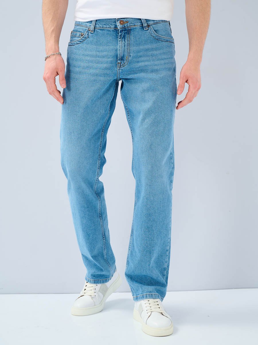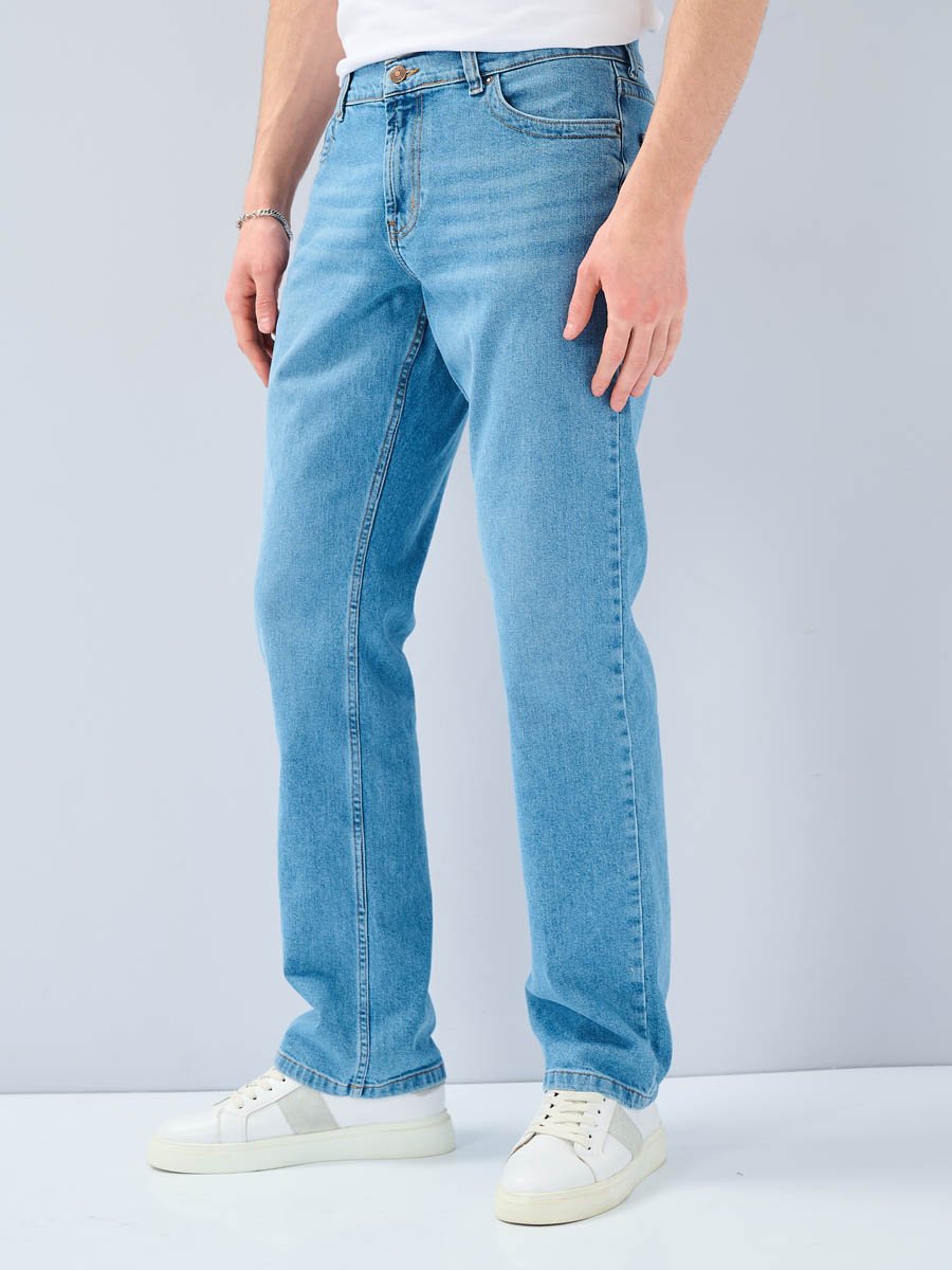 Мужские классические джинсы с пятью карманами. Посадка Regular fit (полуоблегающие по бедру), средняя высота талии. Застежка на молнии. Немного зауженные к низу. Выполнены из слабоэластичной ткани denim comfort stretch. Средняя стирка с  потёртостями и "усами" спереди и потёртостями сзади.