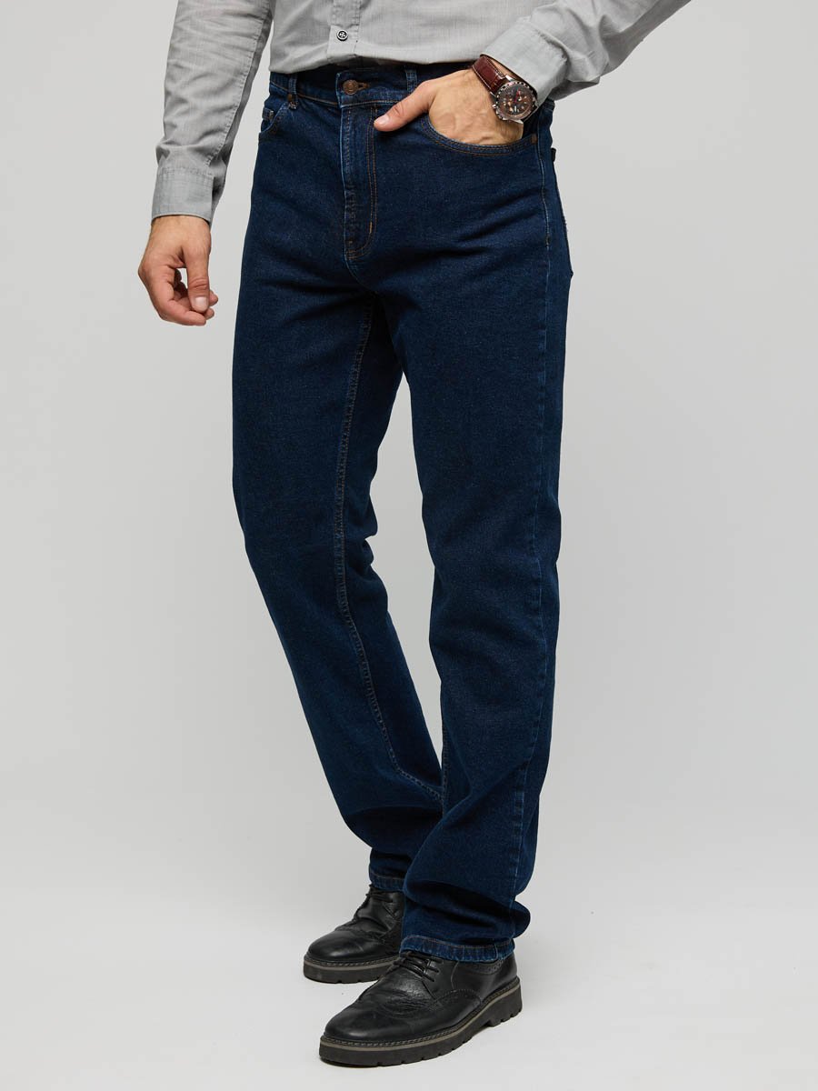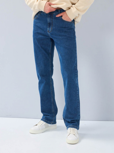 Мужские классические джинсы с пятью карманами. Посадка Regular fit (полуоблегающие по бедру), высокая талия, немного заужены к низу. Застежка на молнии. Выполнены из слабоэластичной ткани denim comfort stretch. Классическая темная стирка с  потёртостями только по швам.