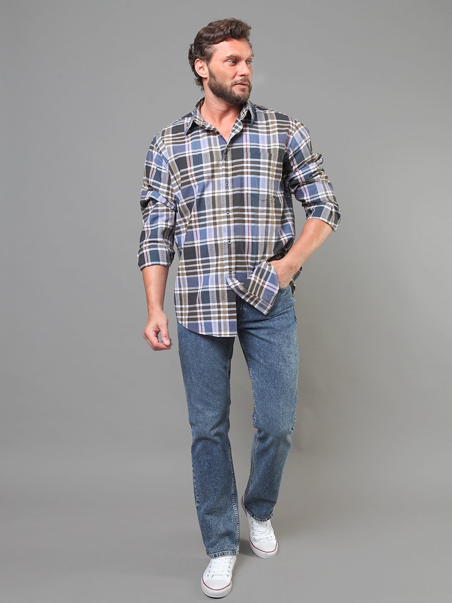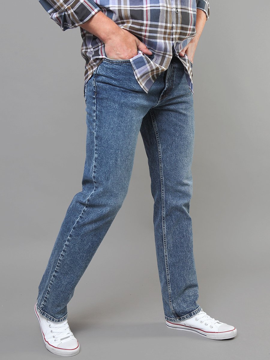 Мужские классические джинсы с пятью карманами. Посадка Regular fit (полуоблегающие по бедру), высокая талия, немного заужены к низу. Застежка на молнии. Выполнены из слабоэластичной ткани denim comfort stretch. Специальная средняя стирка  "towel wash", мраморный эффект. Параметры указаны для размера 32. Длина внутреннего шва   - 83 см.
