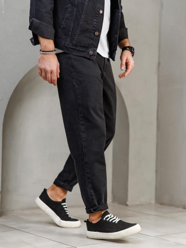 Мужские классические джинсы с пятью карманами. Посадка Regular fit (полуоблегающие по бедру), высокая талия. Застежка на молнии. Зауженные к низу. Выполнены из слабоэластичной ткани denim comfort stretch, цвет ткани Black/Black (лицевая и изнаночная стороны ткани черные). Темная стирка со слабовыраженными потёртостями и "усами" спереди и потёртостями сзади.