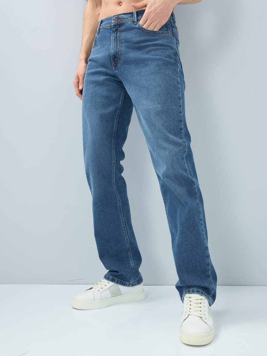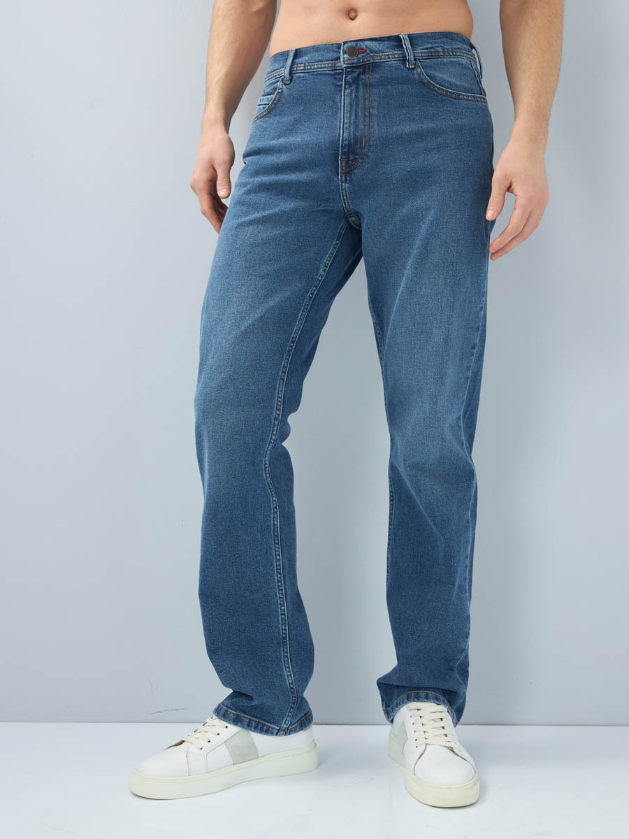 Мужские модные джинсы с пятью карманами. Посадка Regular fit (полуоблегающие по бедру), высокая талия. Застежка на молнии. Выполнены из слабоэластичной ткани denim comfort stretch. Средняя стирка с потёртостями и "усами" спереди и потёртостями сзади.