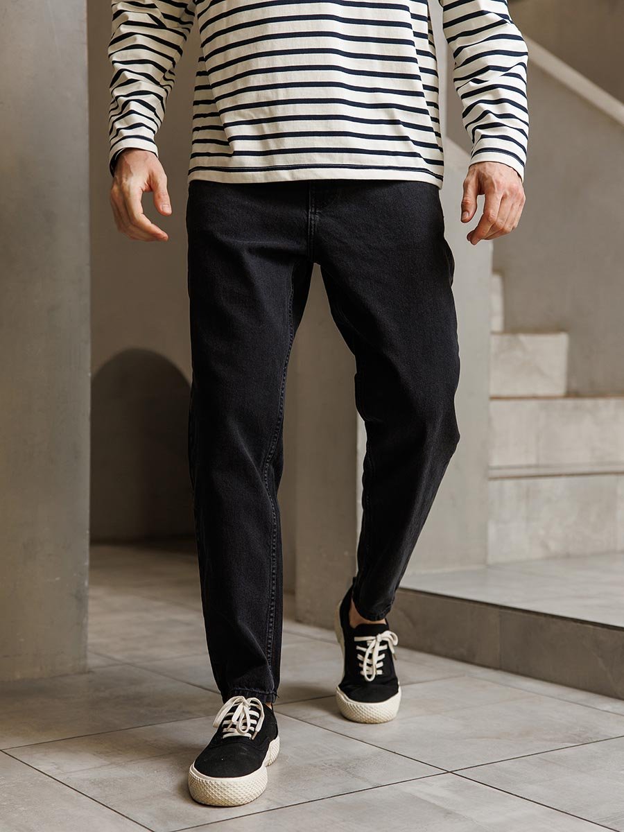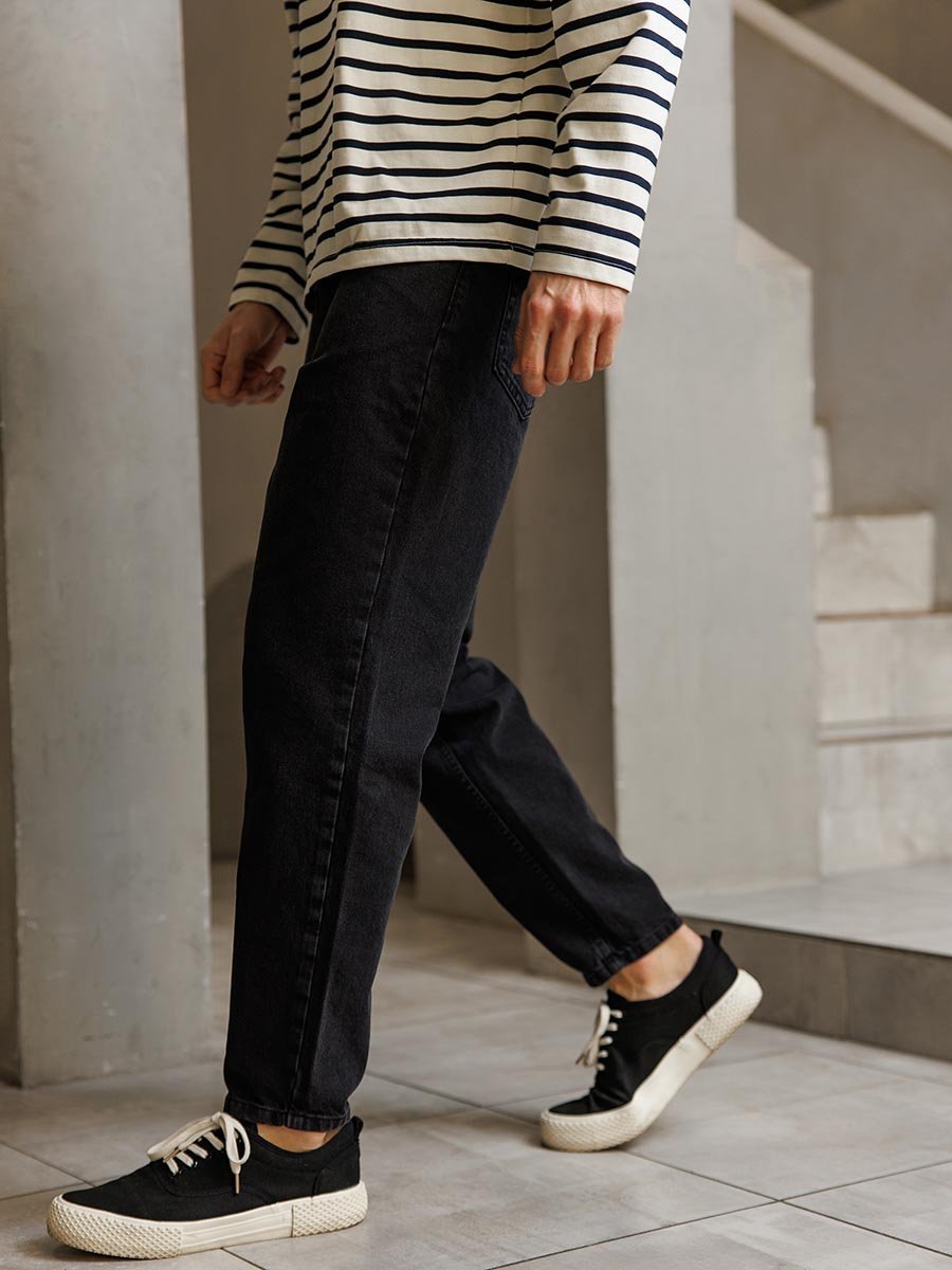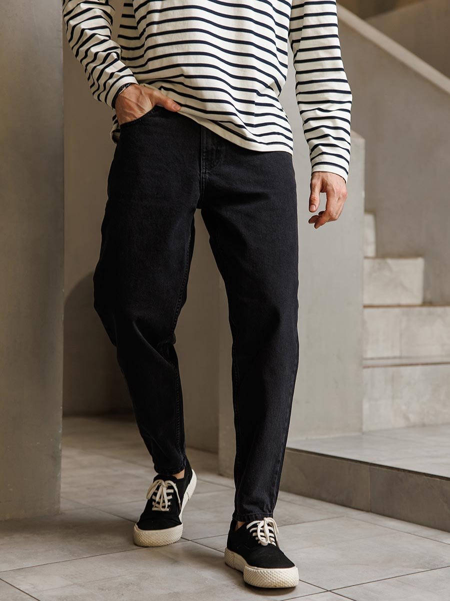 Мужские комфортные модные джинсы "Бананы" с пятью карманами. Высокая талия, свободные по бедрам и бедру и узкие внизу. Застежка на молнии. Выполнены из ткани denim, цвет ткани Black/Black (лицевая и изнаночная стороны ткани черные). Темная стирка с потёртостями по швам.
