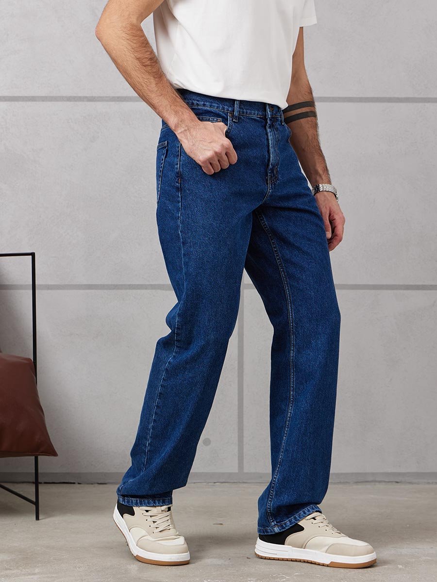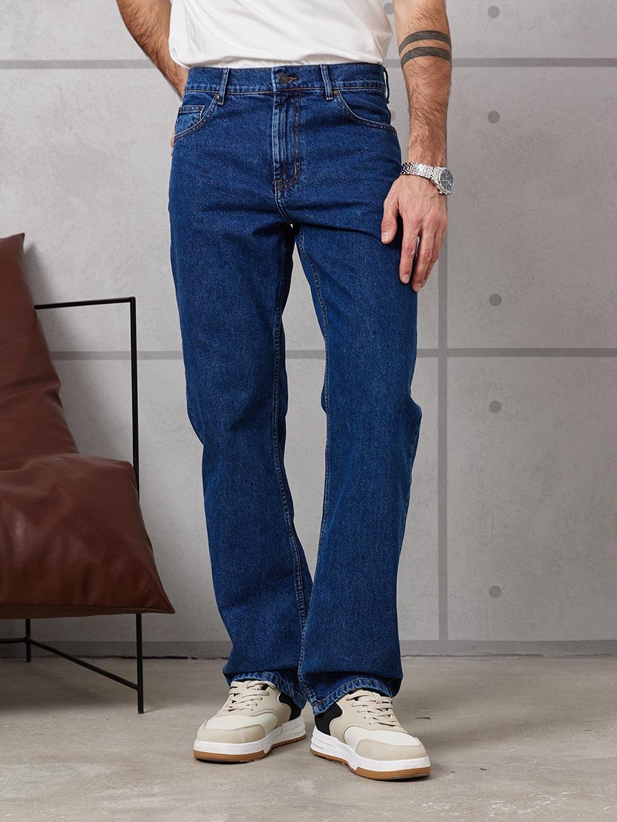 Мужские классические джинсы с пятью карманами. Посадка Comfort fit (свободные по бедру), высокая талия, широкие в колене и по низу. Застежка на молнии. Выполнены из традиционной хлопковой ткани denim. Темная стирка с камнями (stone wash).